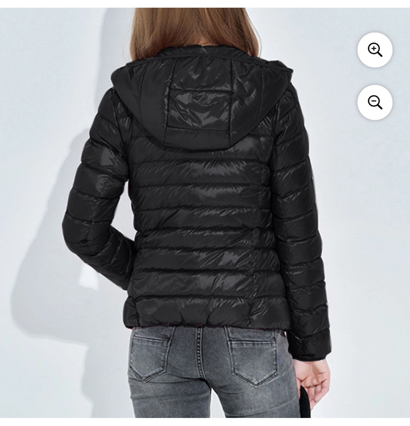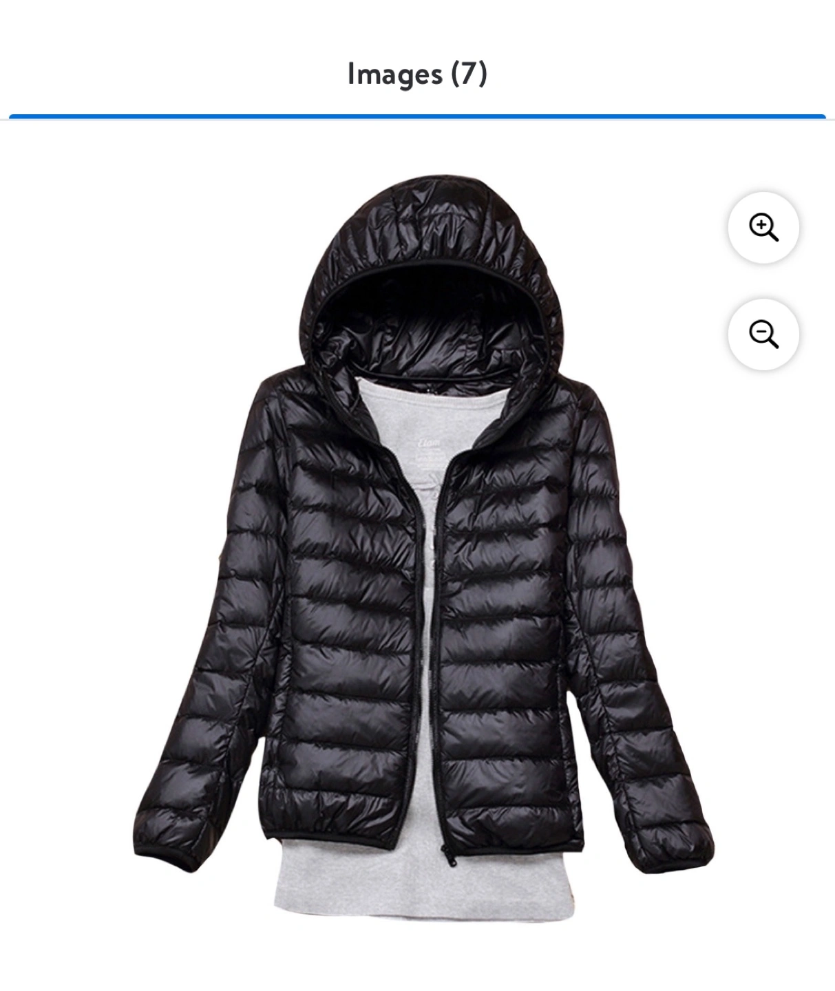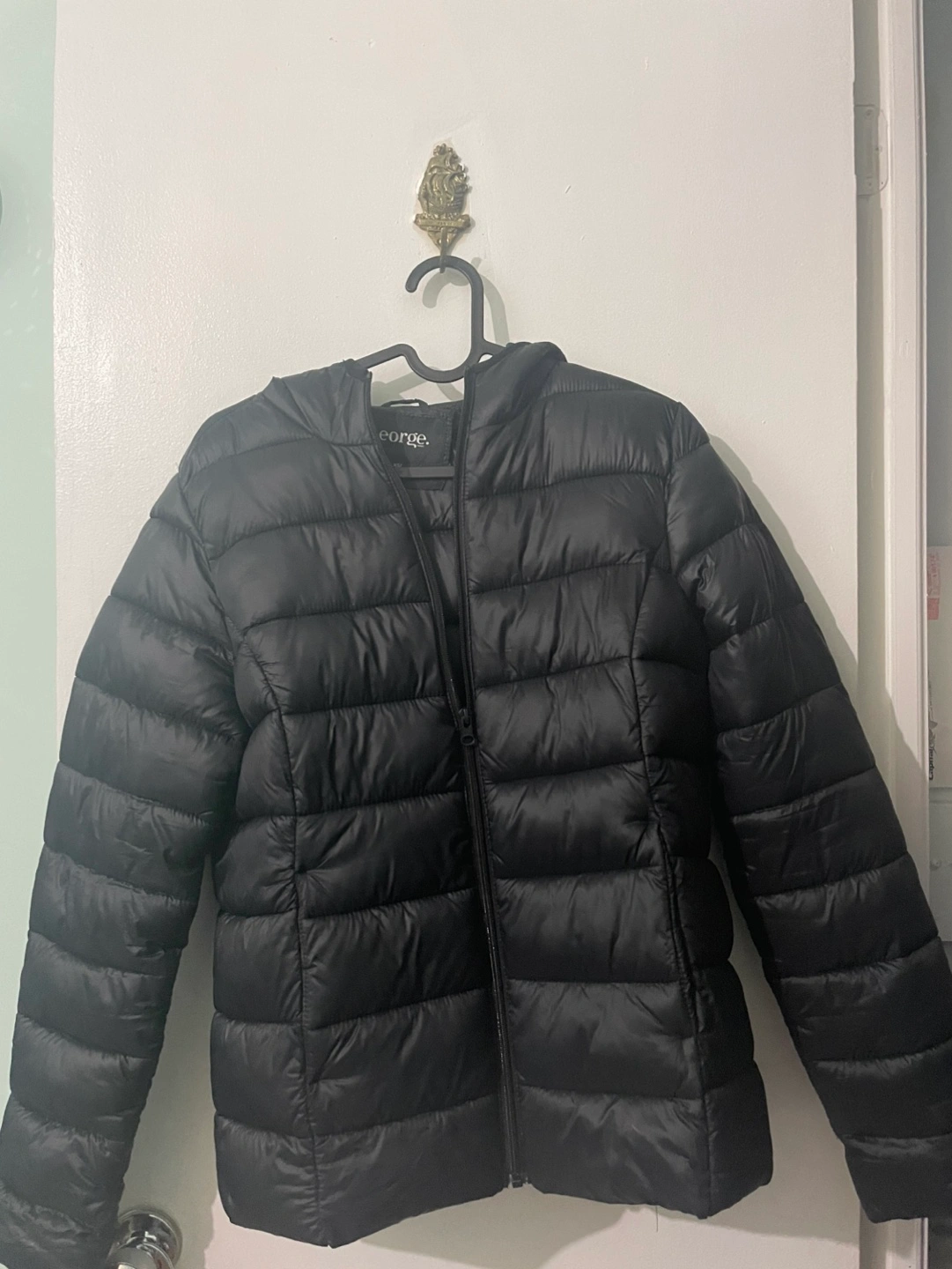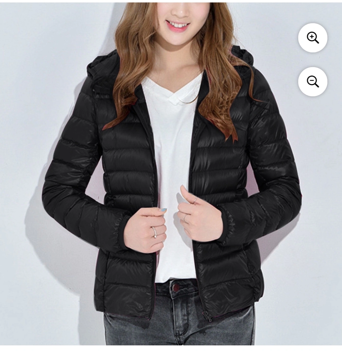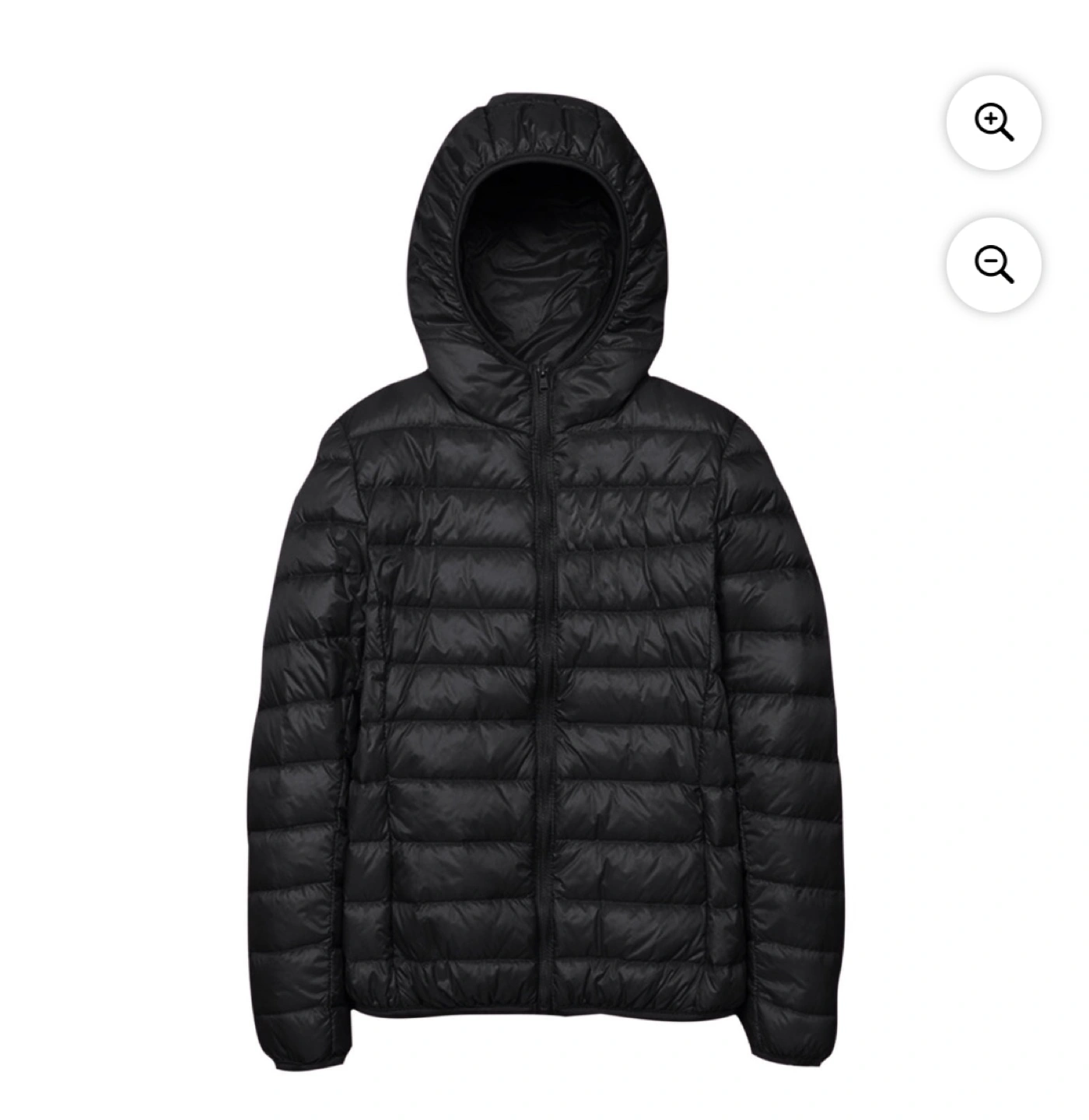Lightweight hooded down jacket. Black colour. Zip front closure. Size chart provided for reference. Perfect for layering. Pic up only