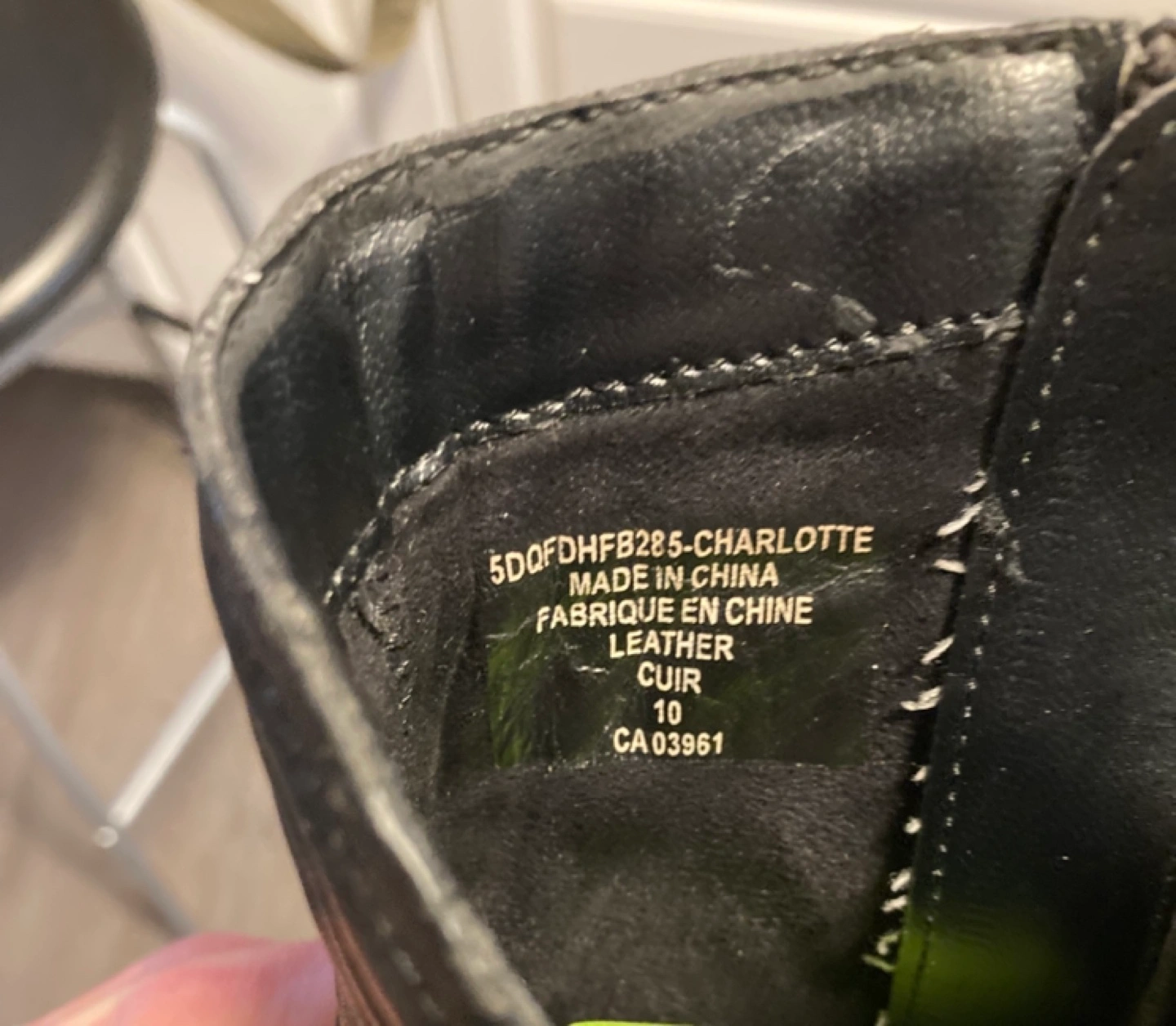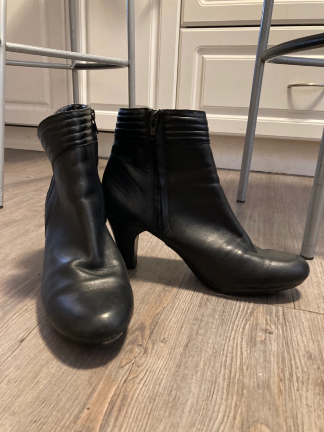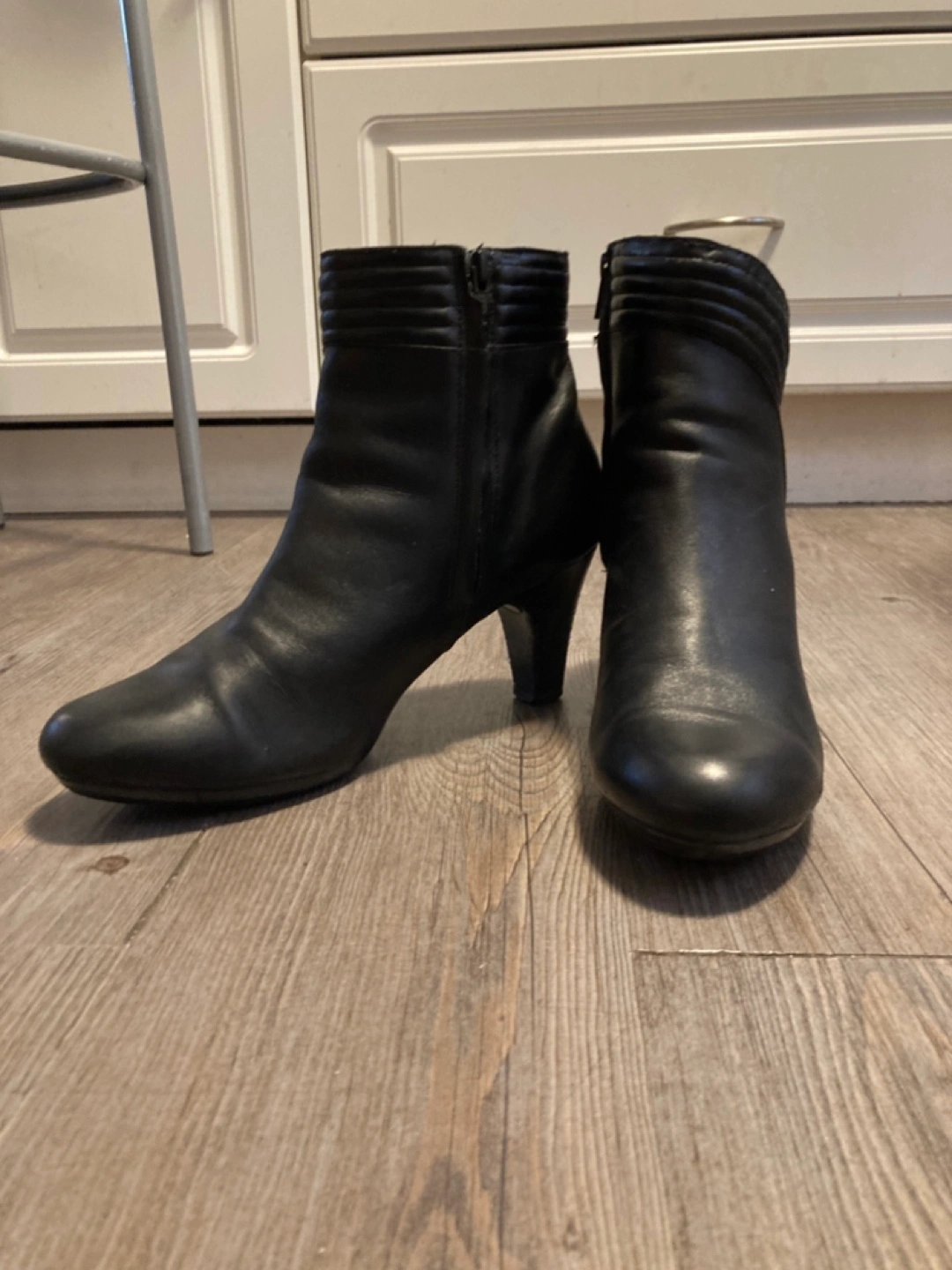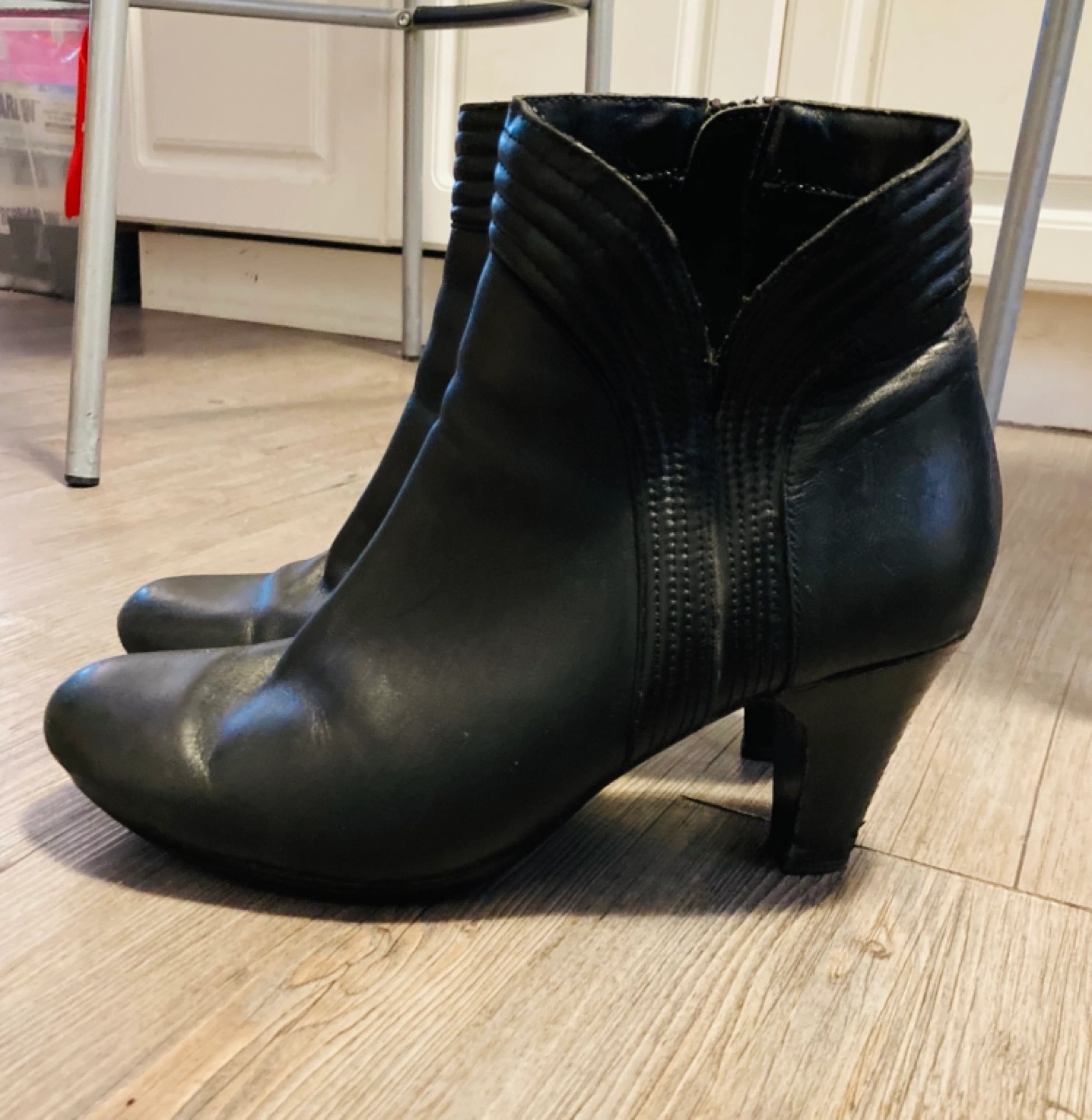 Pair of black leather ankle boots. Size 10. Zip closure. 3” heel. Very good condition