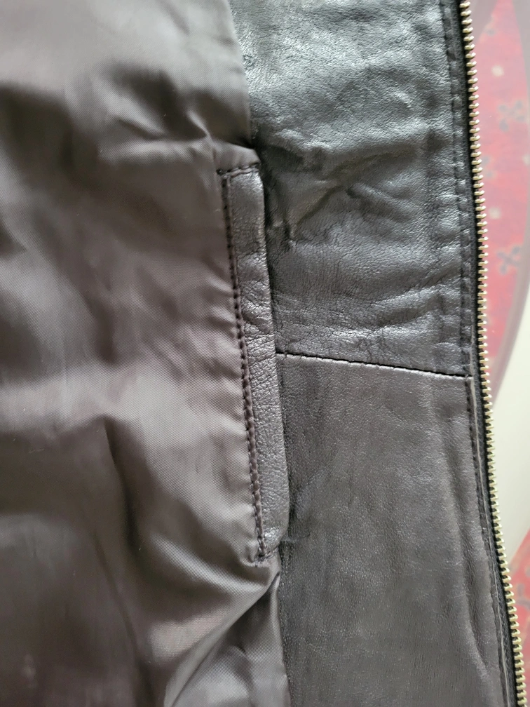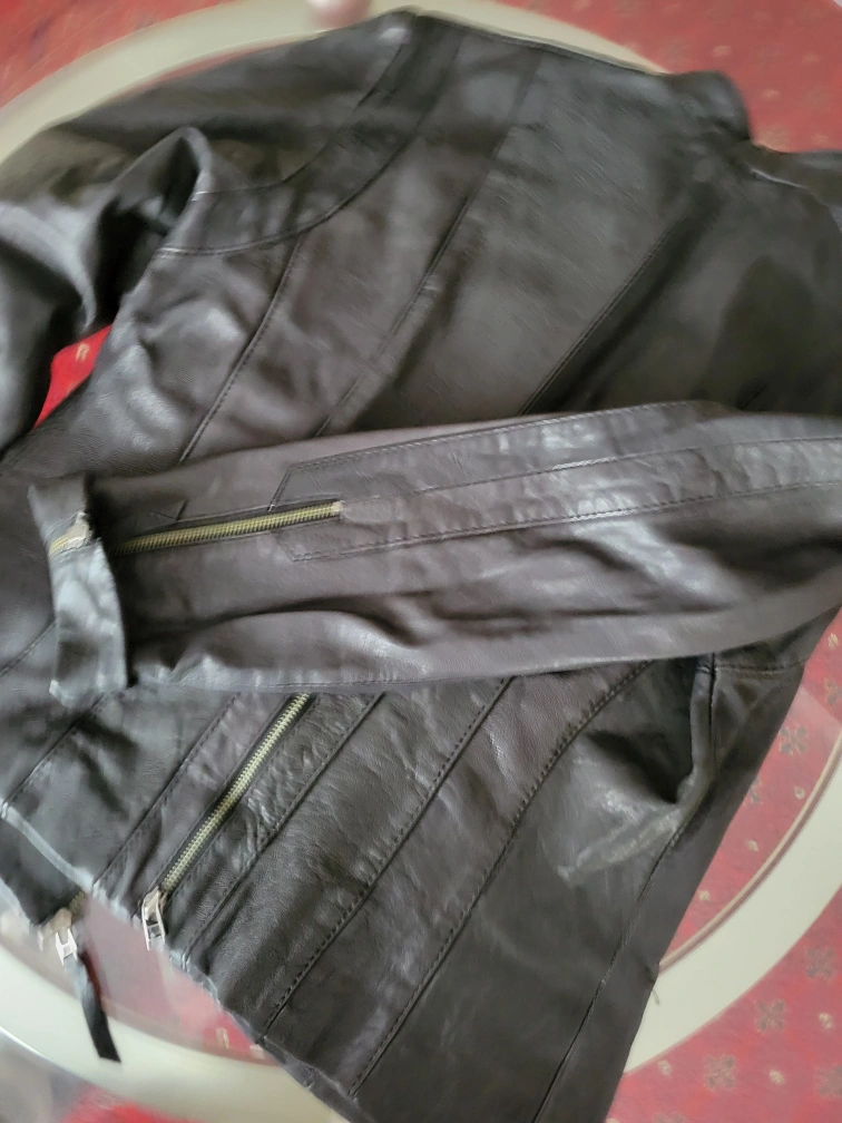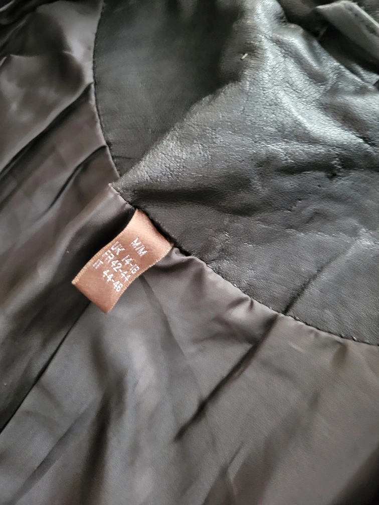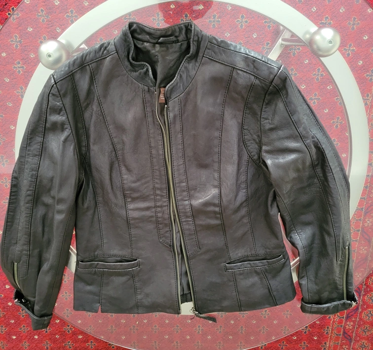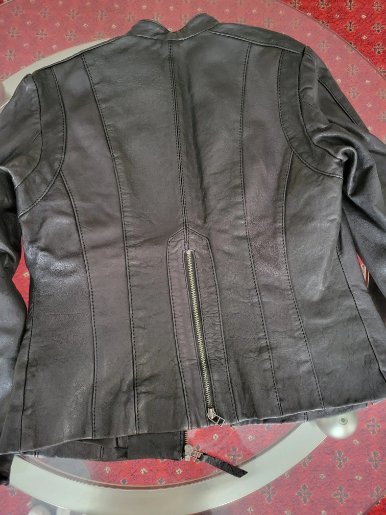 Black leather jacket. Size medium. Full zip closure. Two front pockets. Long sleeves. Good condition.