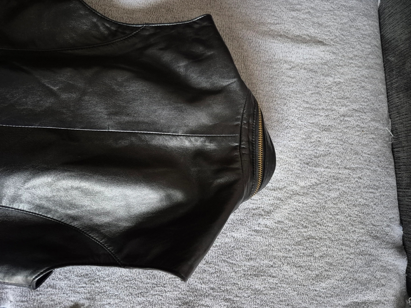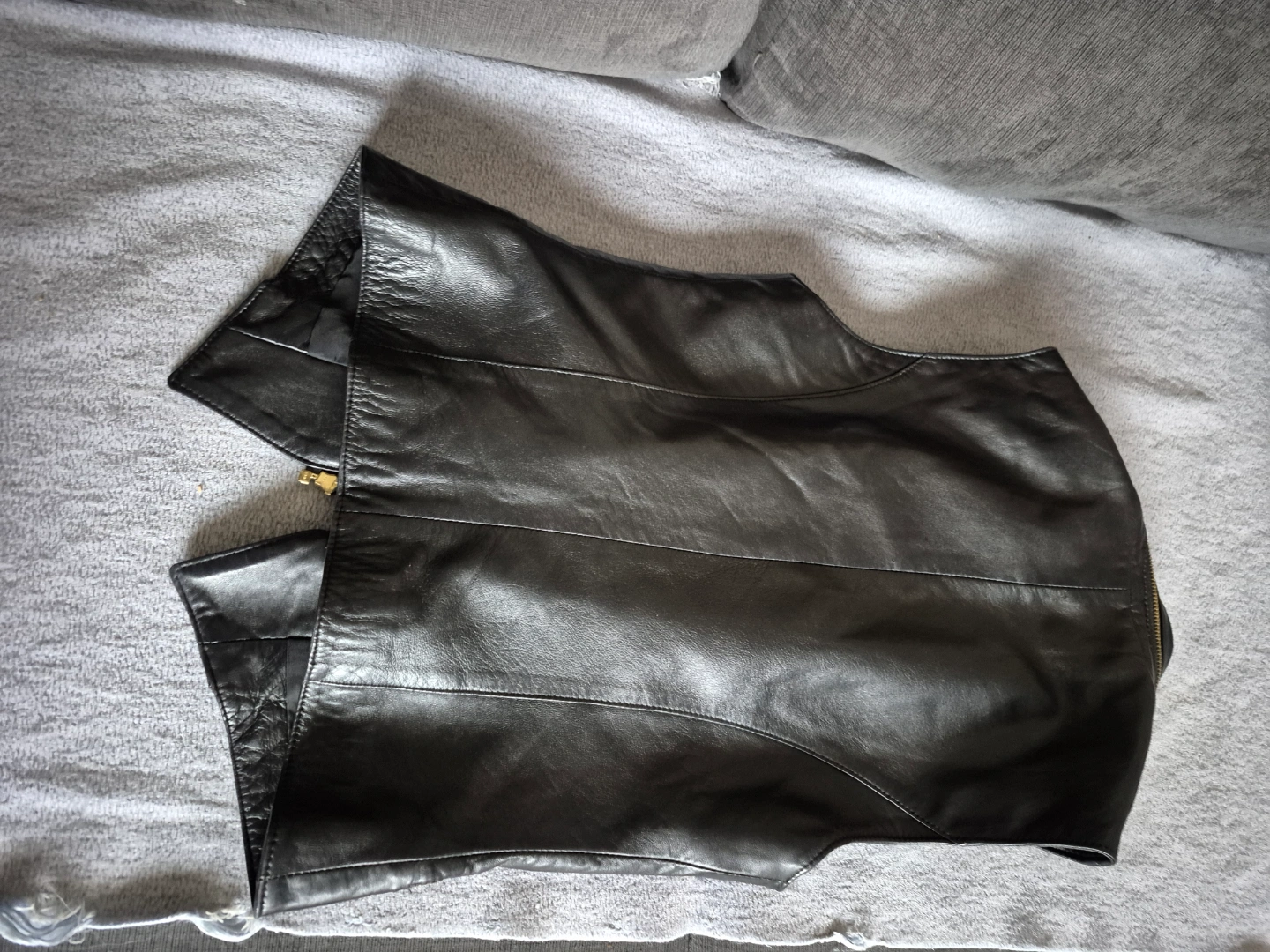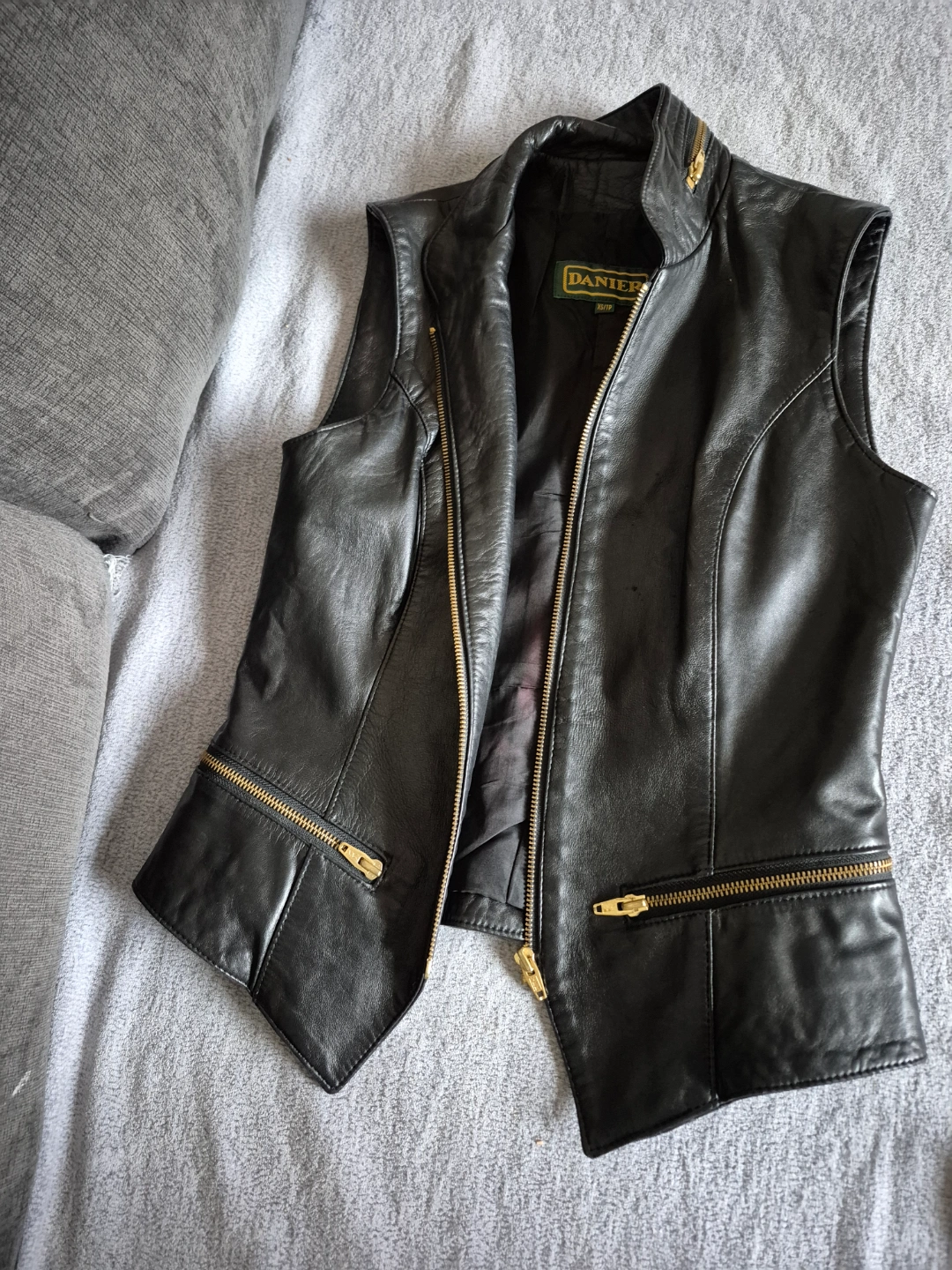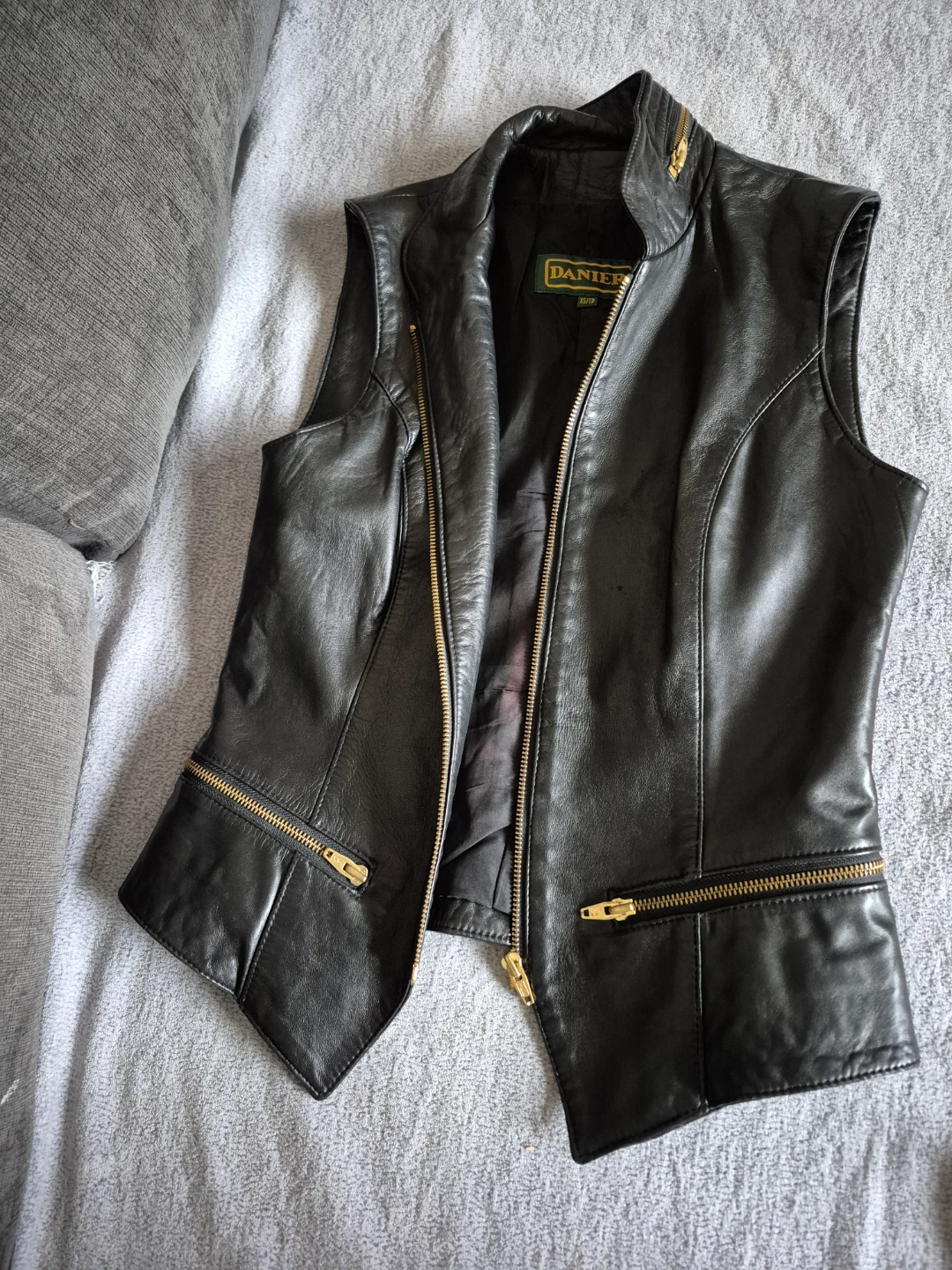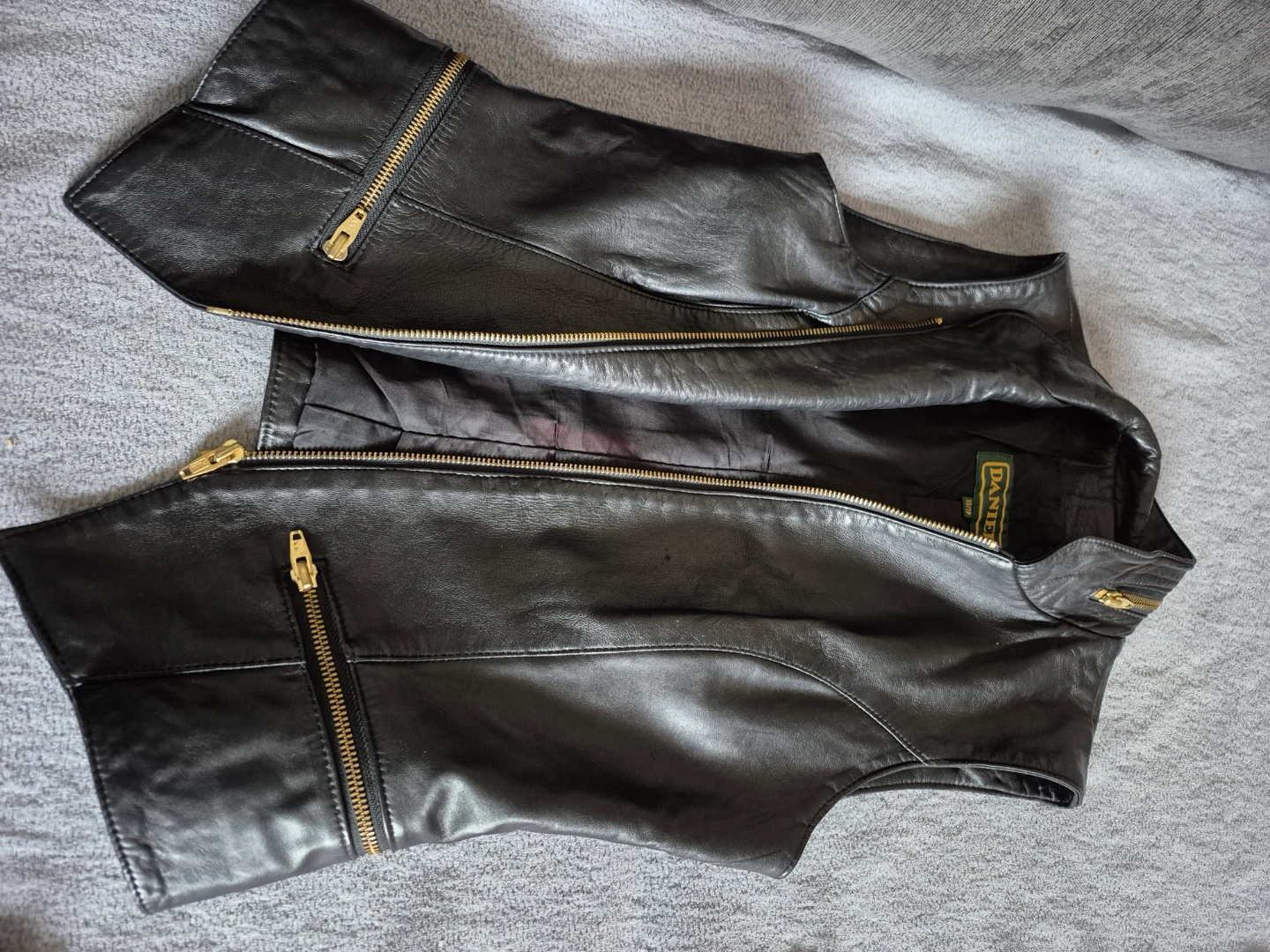Sleek black leather vest. Features gold zippers and a stand-up collar. Zipper closure. Size not specified. Daniel Leather