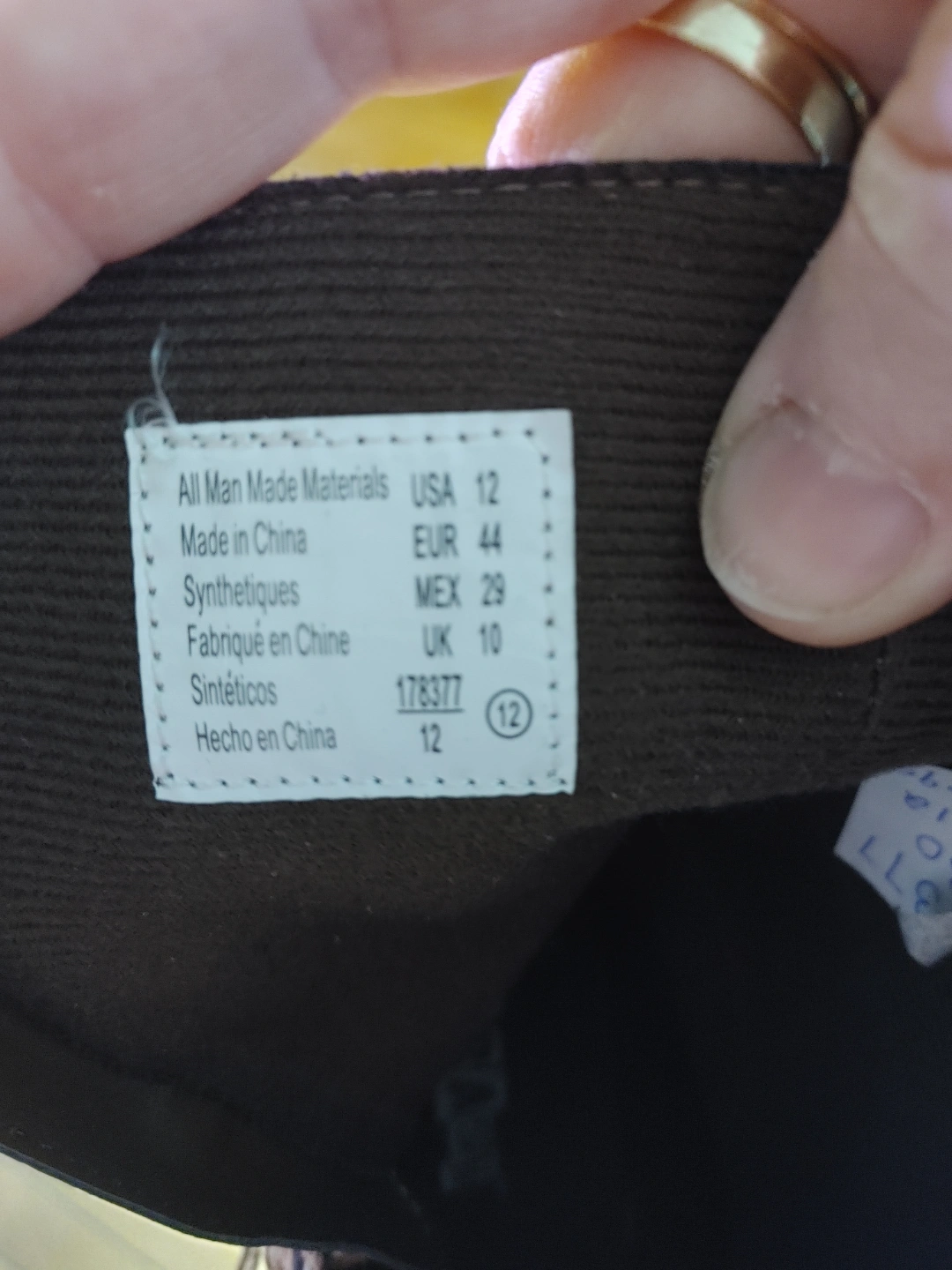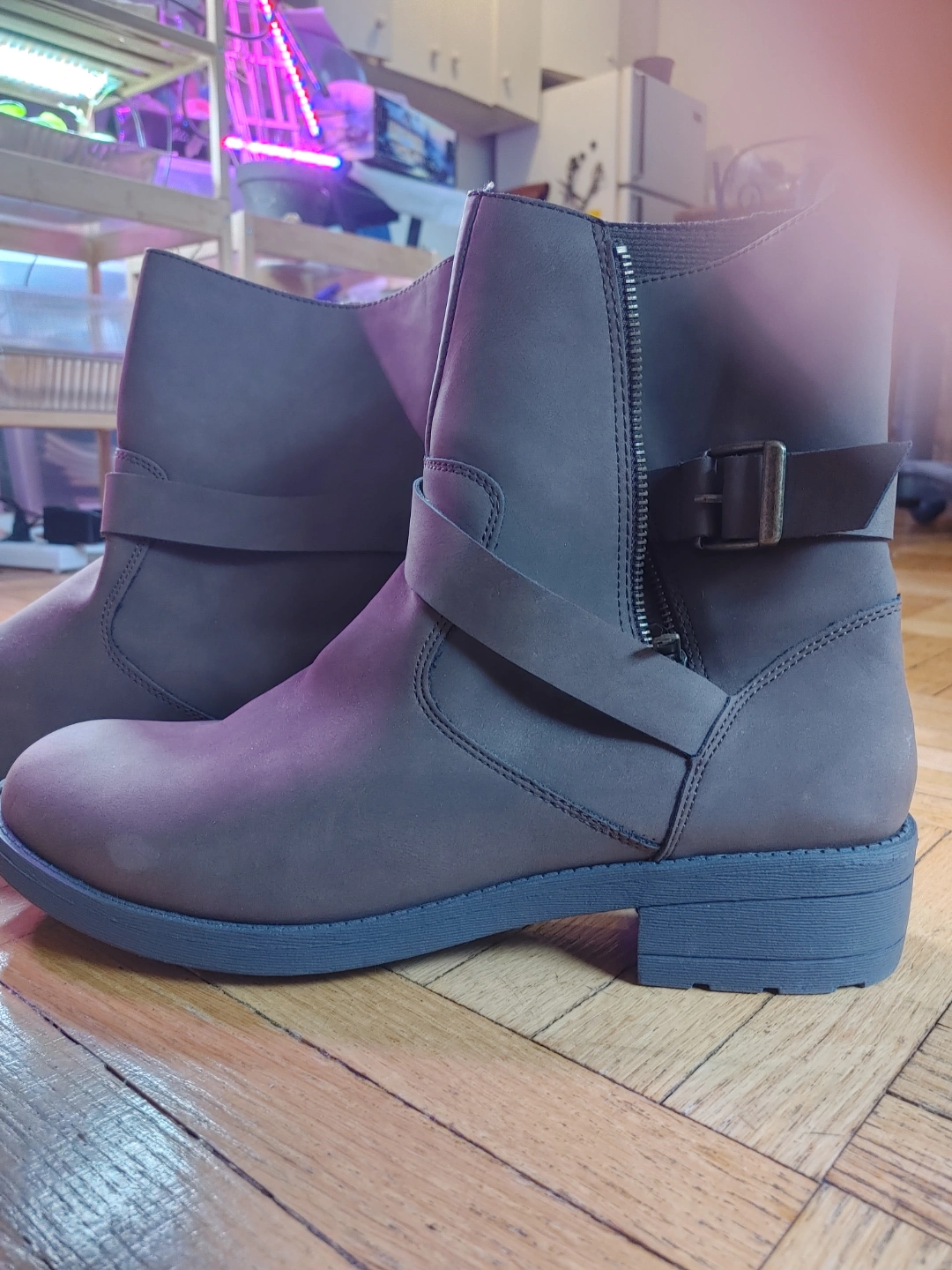 Brown ankle boots. Size 12. Side zipper and buckle detail. Man-made materials. Made in China.
