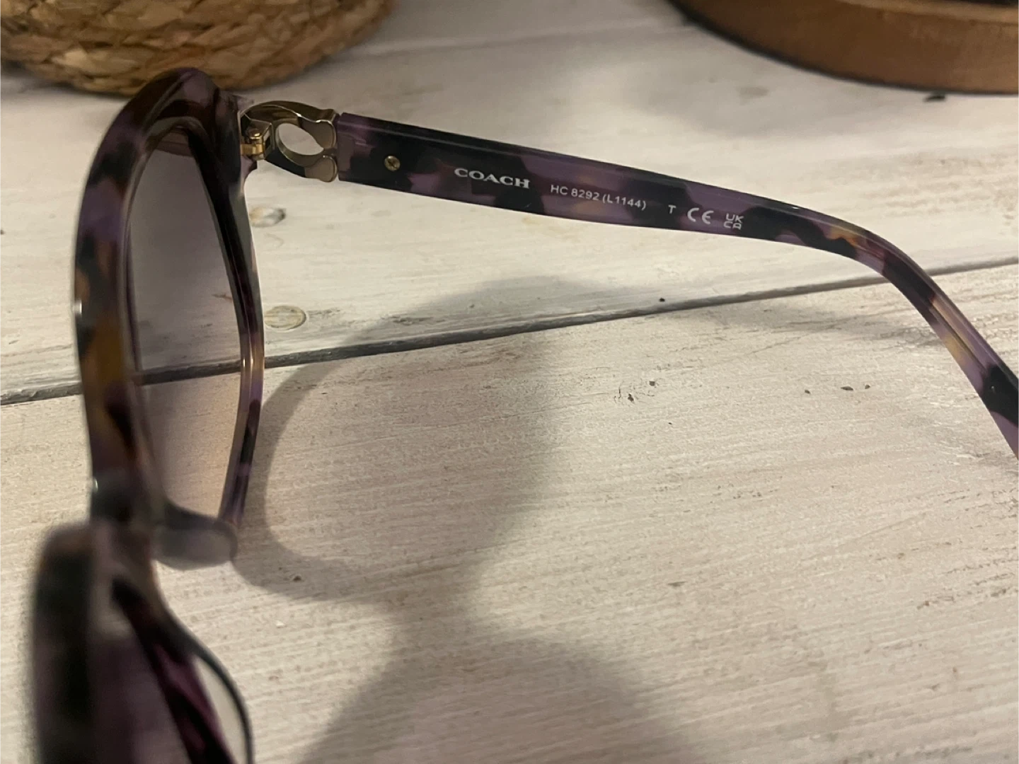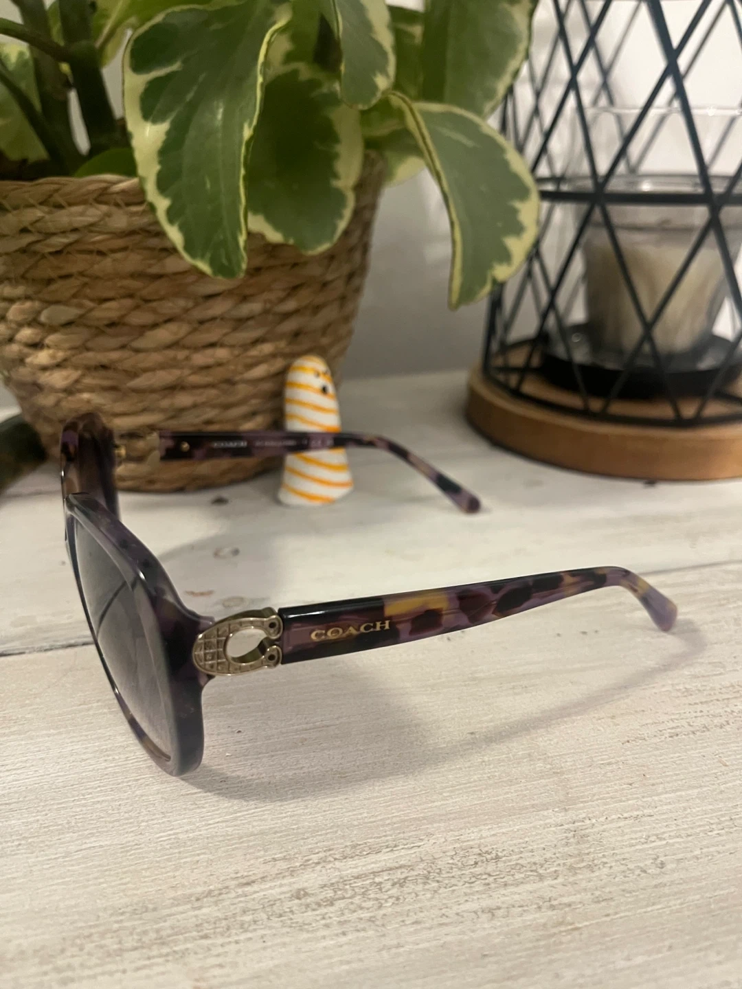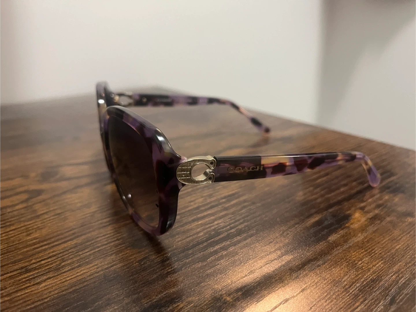 These Coach sunglasses are in great condition only worn a few times. Some scratches on arm of sunglasses (see pictures). The model number is HC 8292 (L1144). They feature a stylish purple tortoise shell pattern.