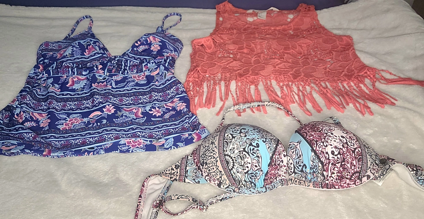 Swim tops And cover-ups COVER-UPS * Coral H&M Coachella lace crop top with fringe. Small *Madden NYC cover-up wrap in a blue and white tie-dye. SWIM TOPS * LA Vie en Rose Aqua Bikini top in a doily print design. Small sold *George swim top with a floral and Intricate pattern. Small 15 each or best offer. ♡No Holds ♡First Come First Serve ♡Serious Buyers Only Please.