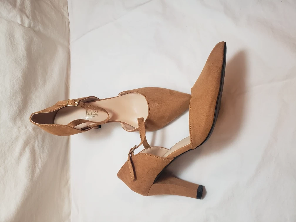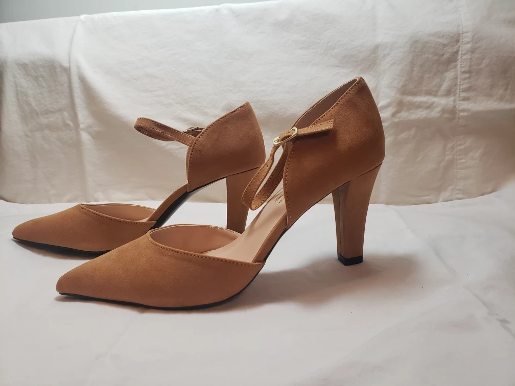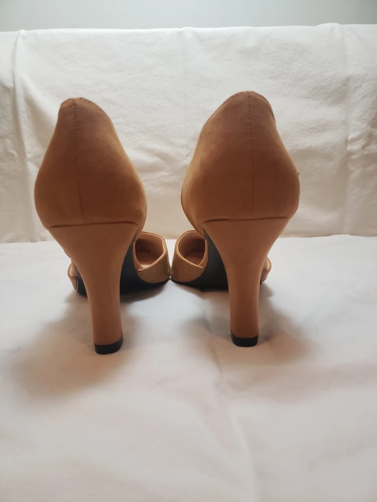 Tan colored Faux Suede 3" heels size 9. Mint condition. Never worn ,still have orginal box.