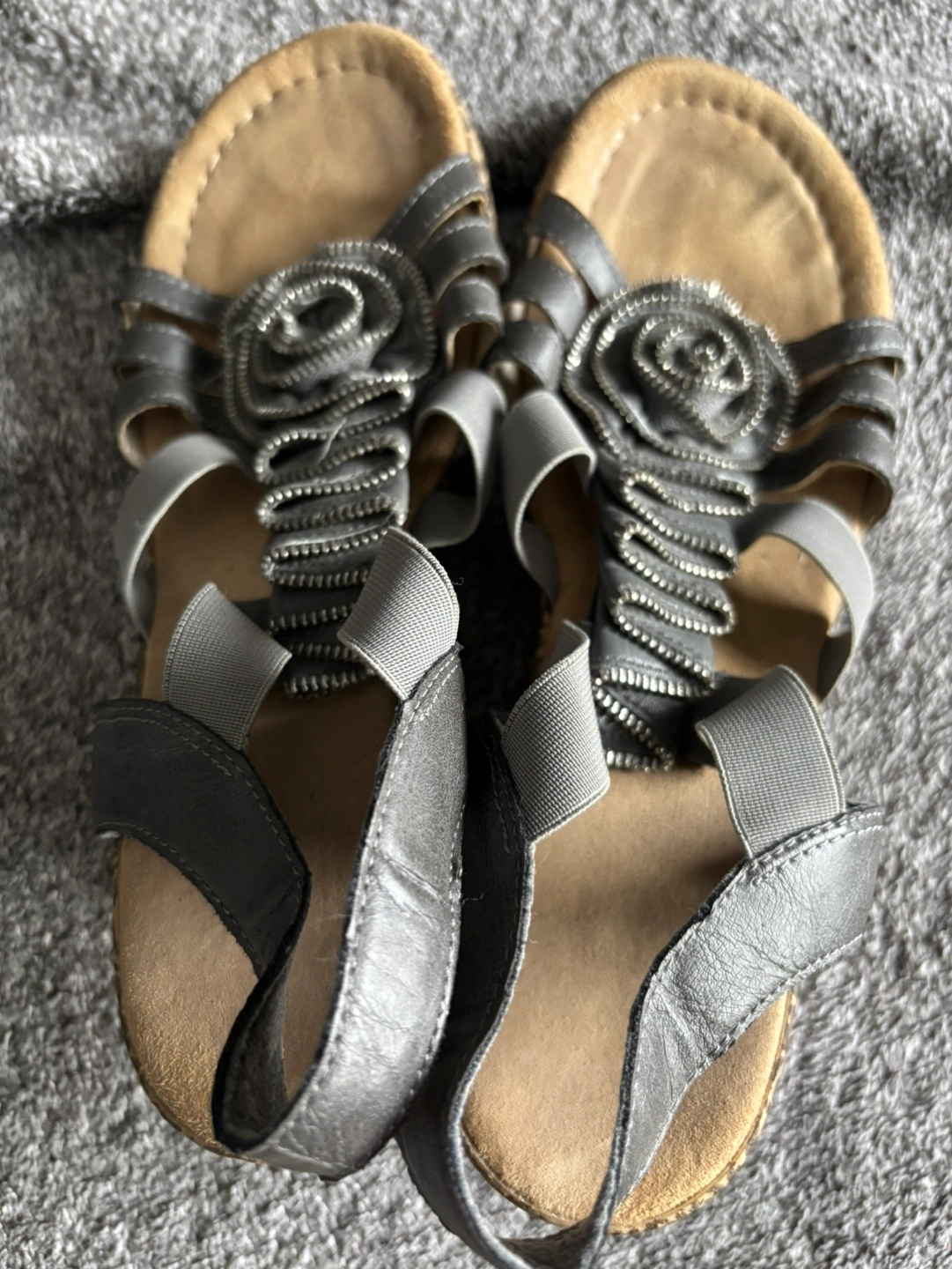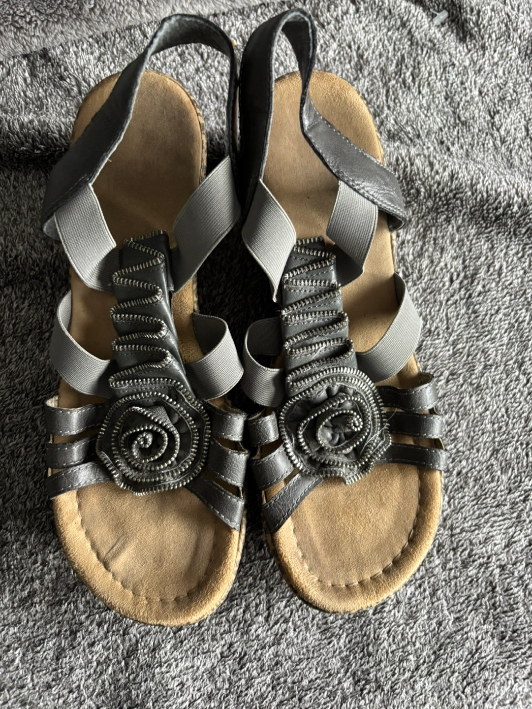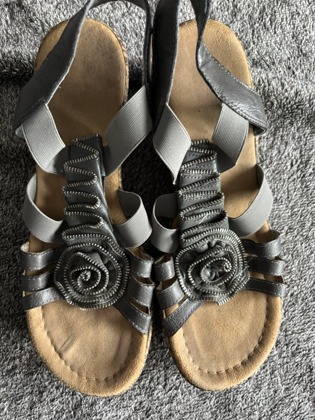 Rieker women's grey leather sandals. Wedge heel. Pretty rose detailing. Great condition.