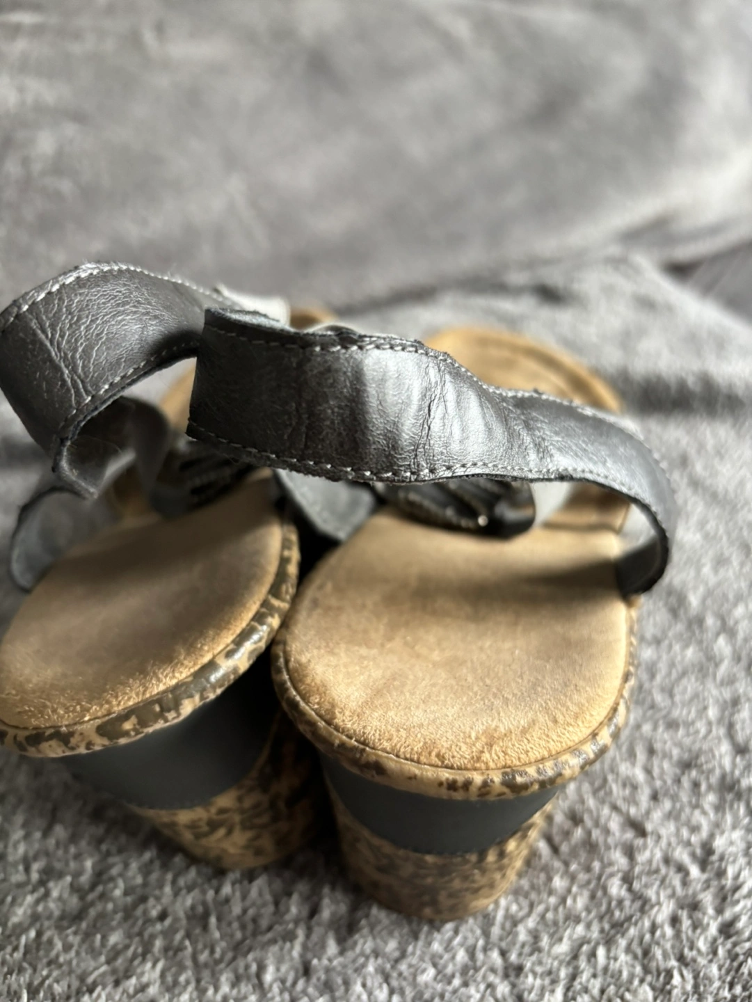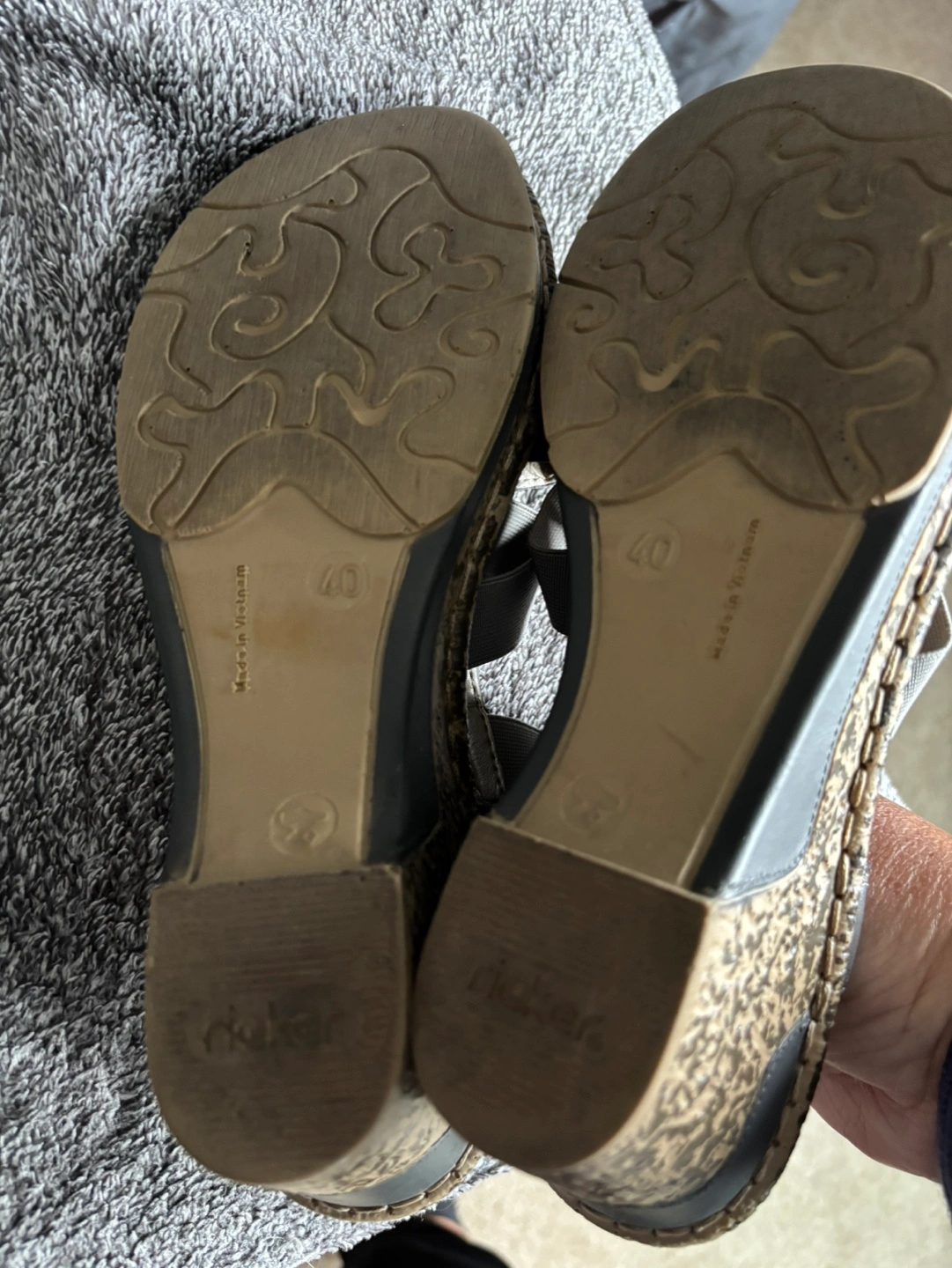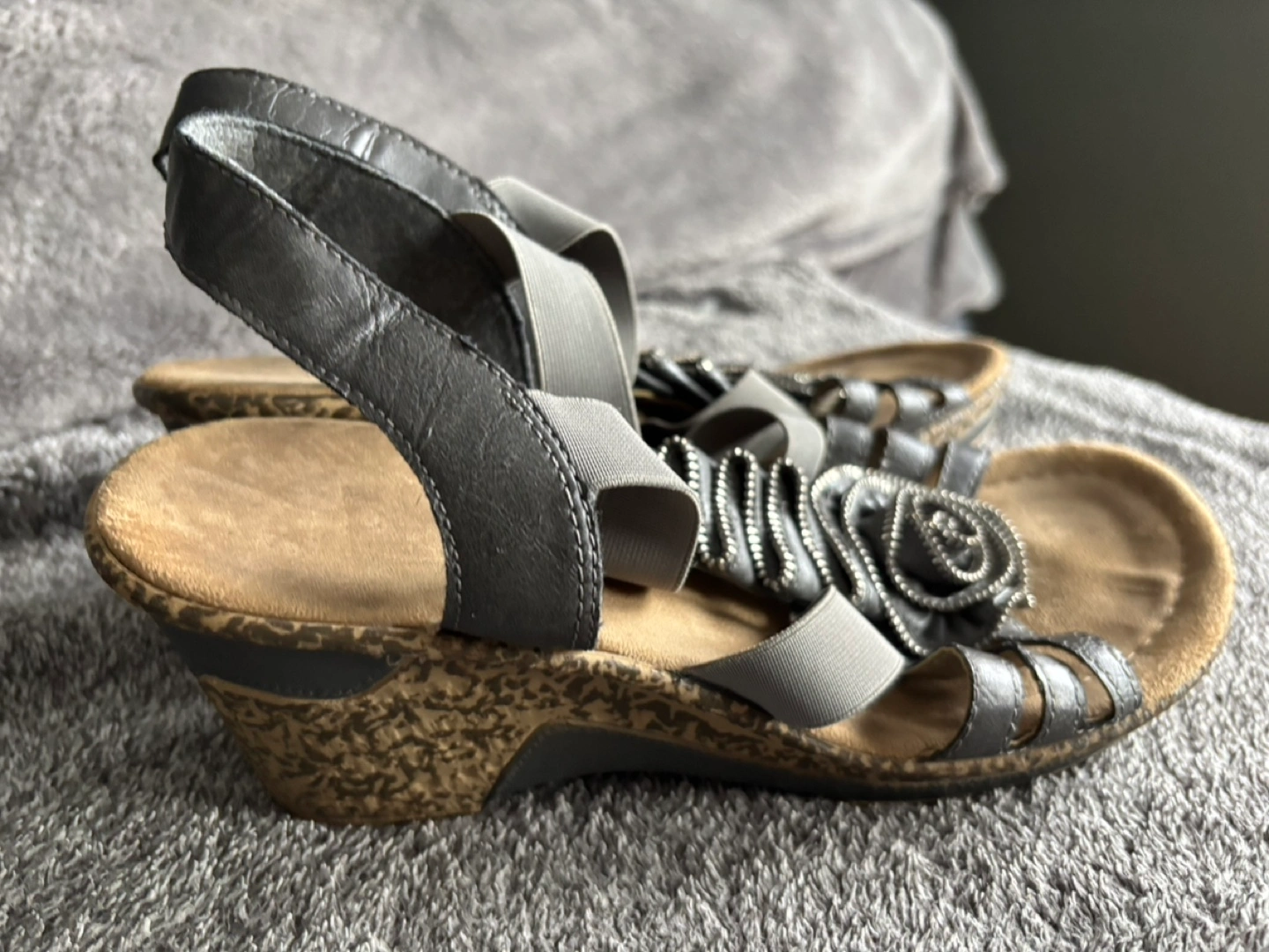Rieker women's grey leather sandals. Wedge heel. Pretty rose detailing. Great condition.