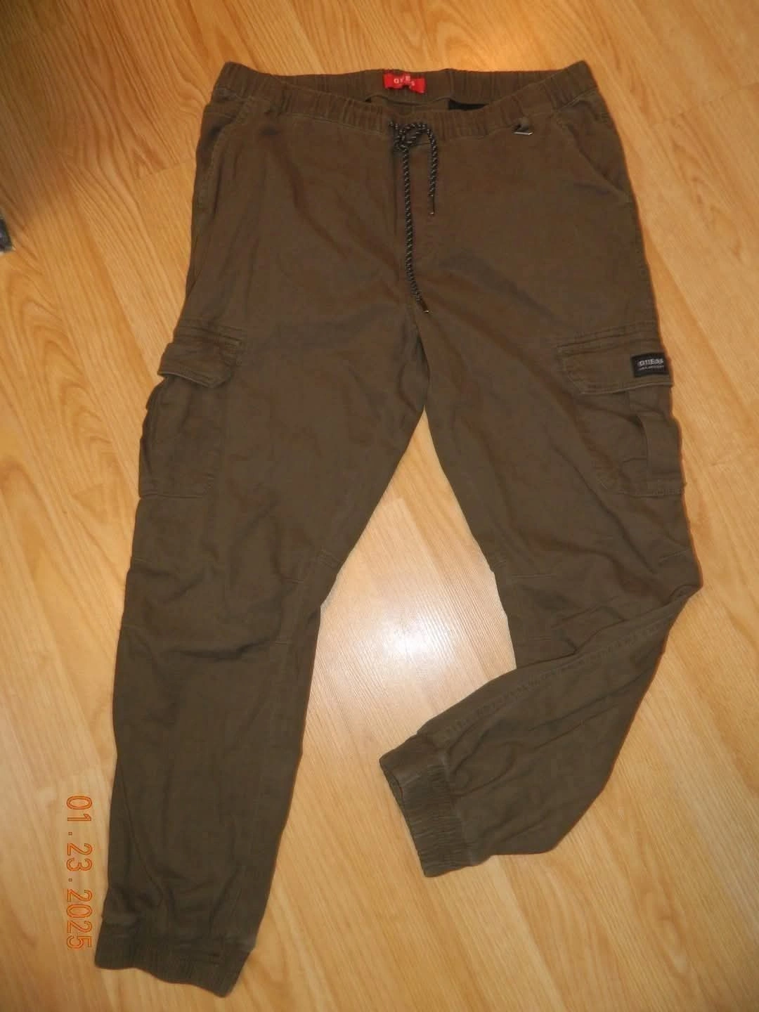 These are a pair of Guess cargo pants in an olive green colour. They feature an elastic waistband with a drawstring for a comfortable fit. There are cargo pockets on the sides for added utility. WOMENS GUESS CARGO JOGGERS size L...VGUC-EUC