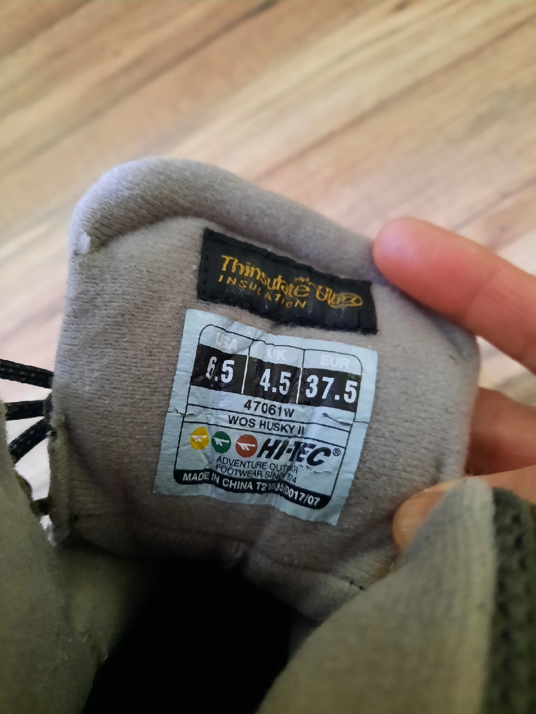 Hi-Tec WOS Husky II hiking boots in size 6.5. These boots feature Thinsulate Ultra Insulation and a carbon rubber sole. They are adventure outer footwear and made in China.