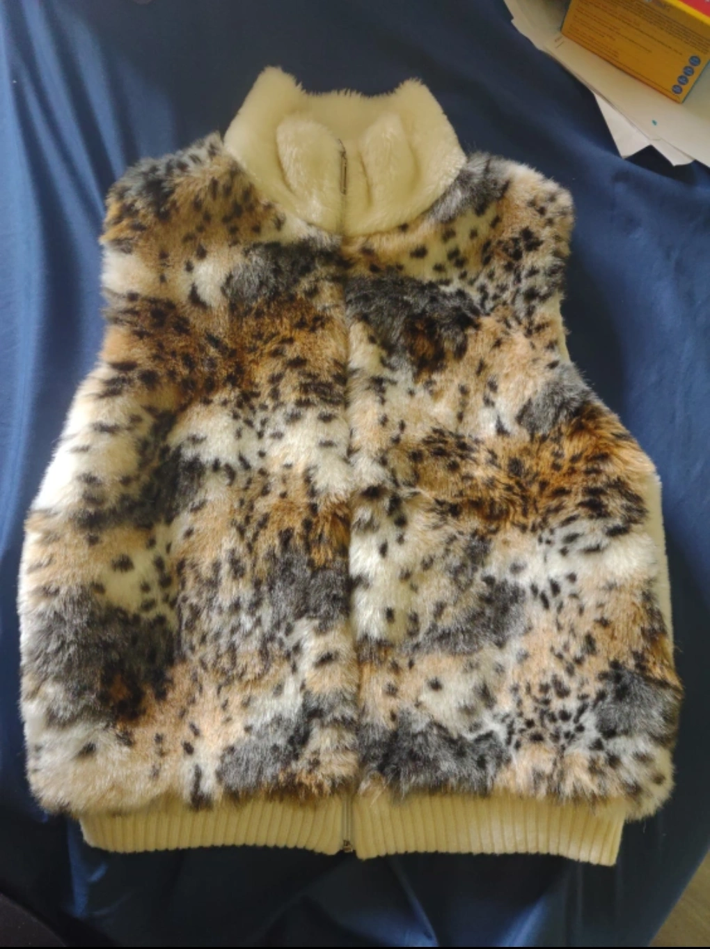 Warm and stylish faux fur vest with side pockets. Features a leopard print design. Soft and comfortable. Zipper closure. Cream coloured ribbed knit bottom. cash and pick up only