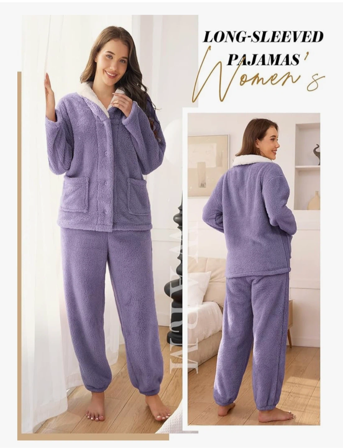 Cozy up with this long-sleeved women's pajama set! It's made of 100% polyester, making it super warm, comfortable, skin-friendly, and breathable. The set features a double-layer fleece lapel, a double pocket design, and a bundle foot design for extra warmth and comfort