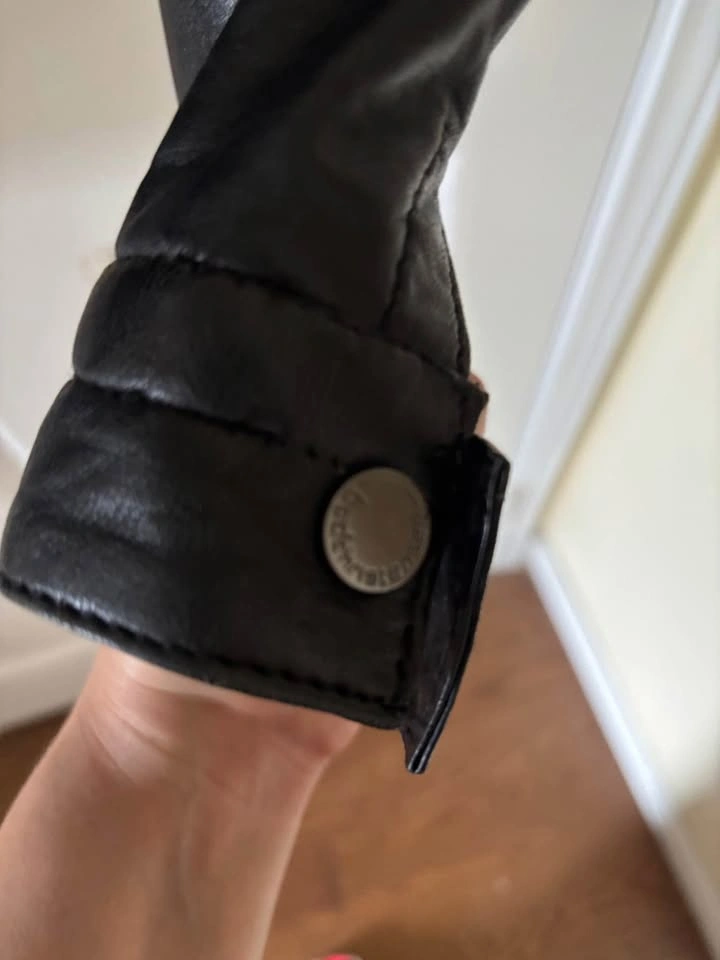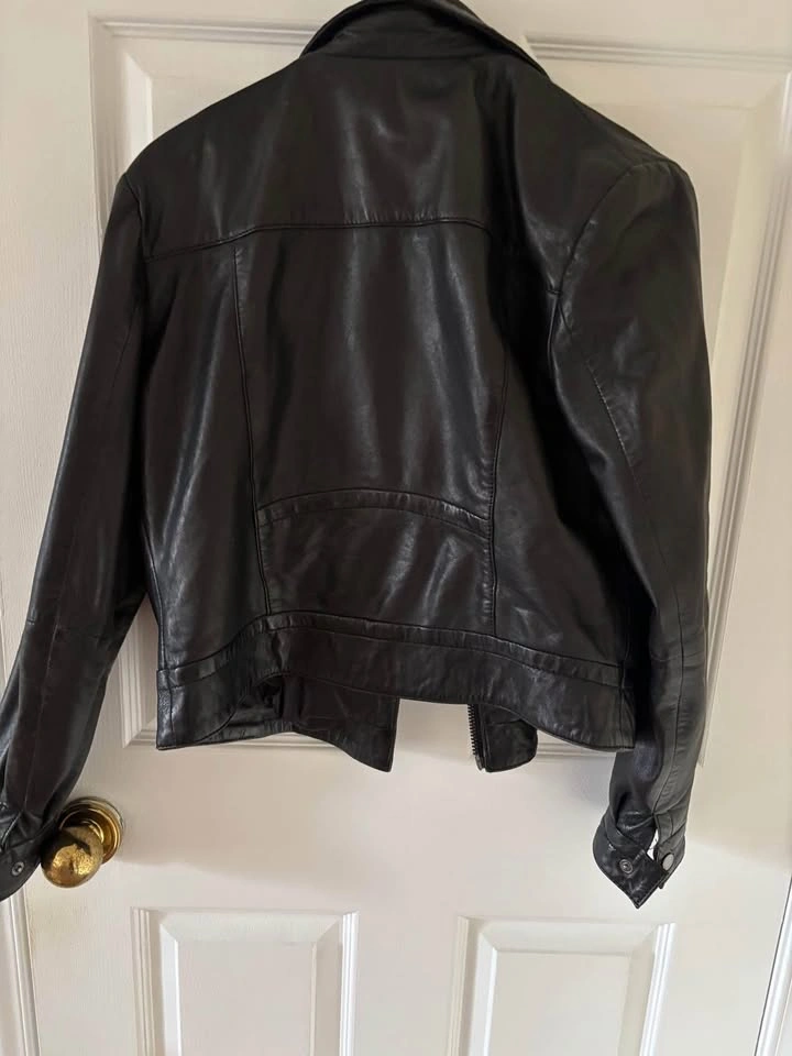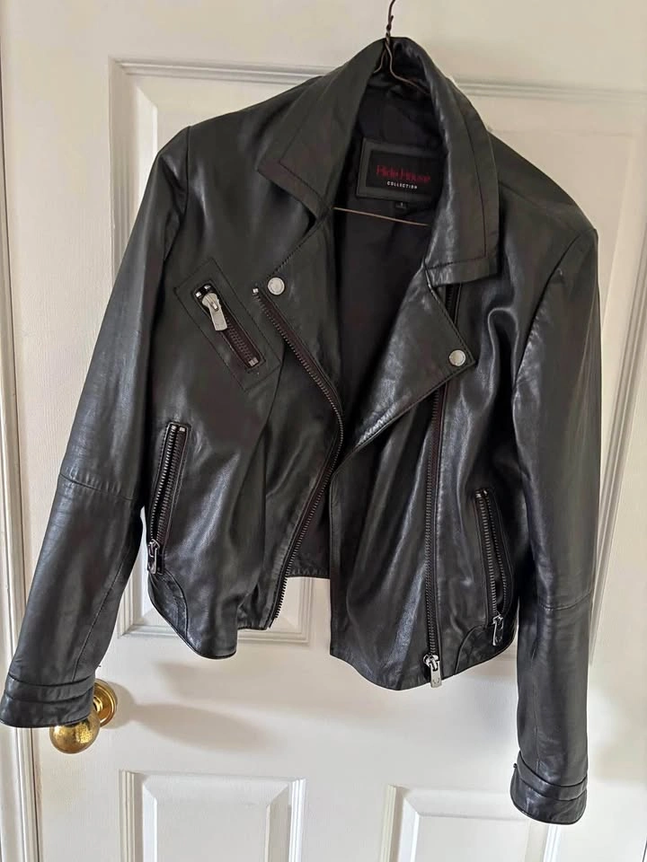 This Women’s cropped Leather Jacket was bought at a leather specialty store in Acton called The Hide House. This Jacket is a women’s motorcycle jacket in a size small. This leather jacket has silver zipper detailing on the breast and silver buttons at the wrist. This leather Jacket would pair nicely with a dress or blouse for a night out. Cash only. Pick up only.