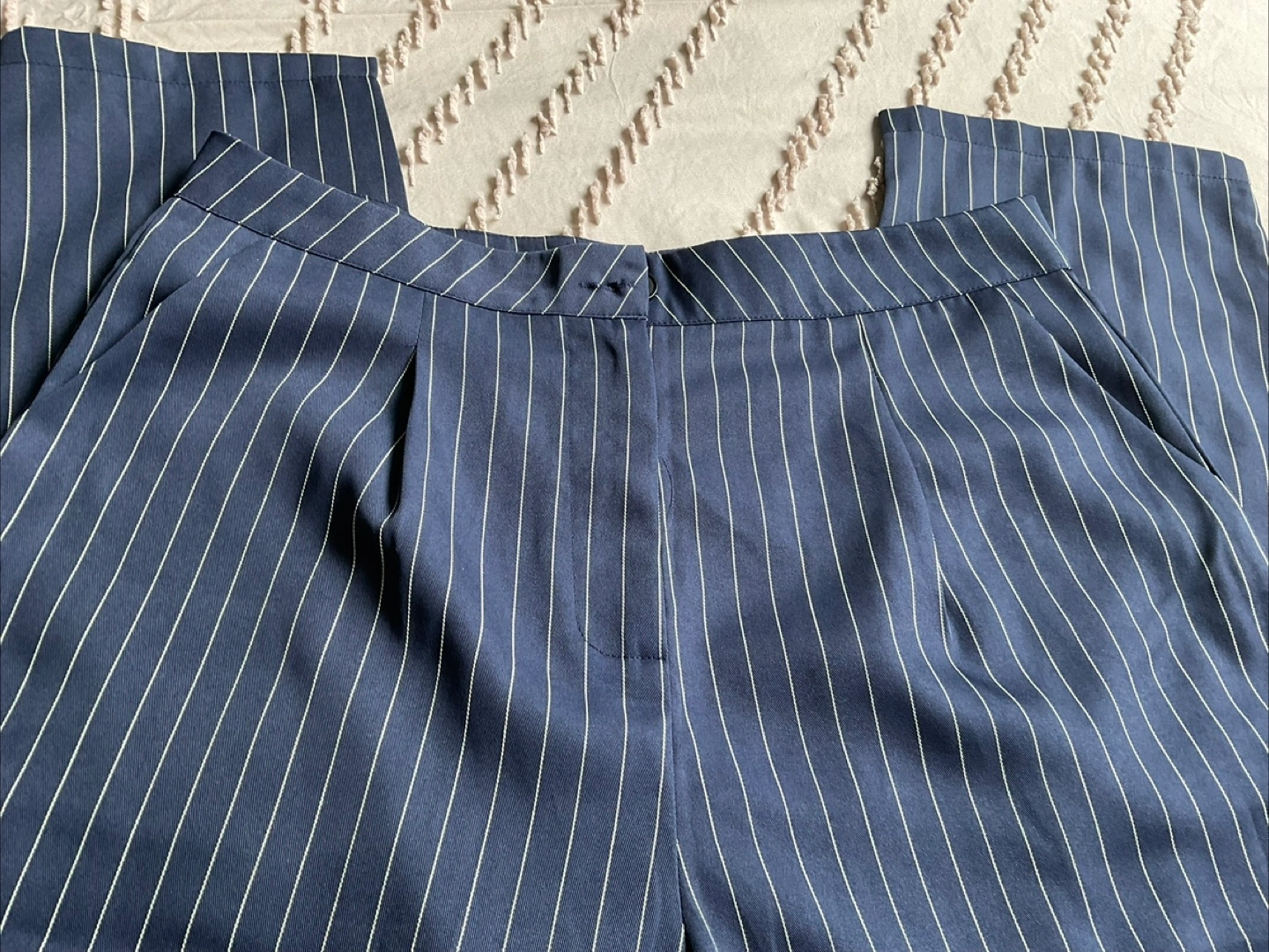 Elegant navy pinstripe pantsuit. Includes blazer and trousers (2pockets). Size XL. Excellent for work or special occasions. Classic style.