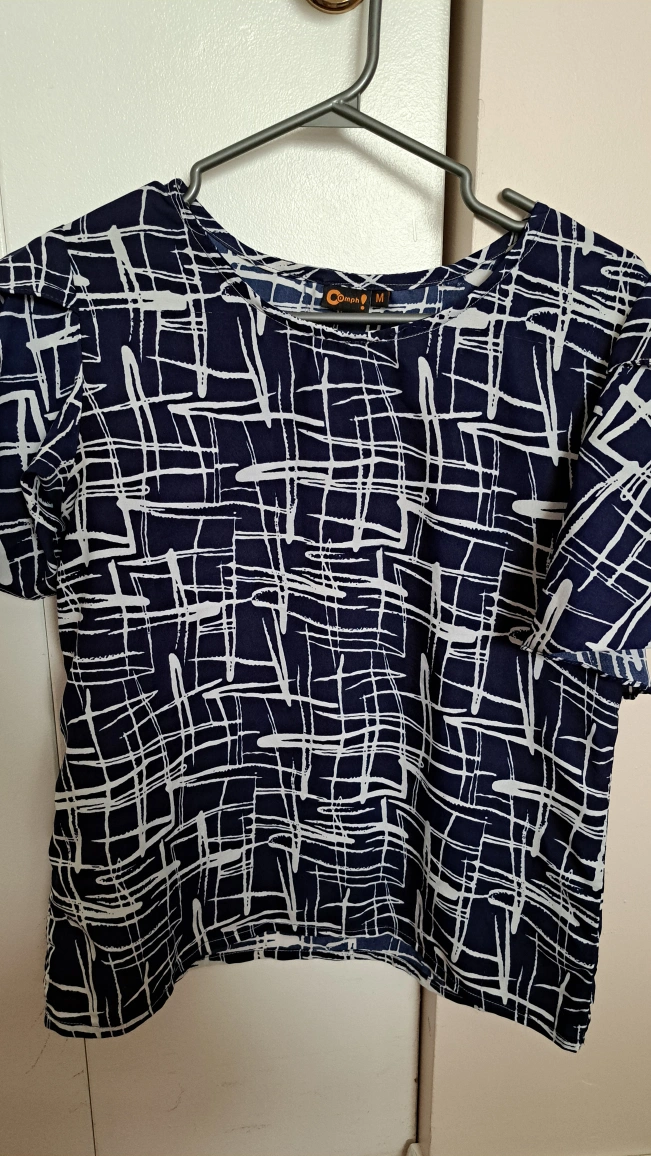 Stylish women's blouse. Size medium. Dark blue with white abstract print. Short sleeves with a slight ruffle detail. Casual, comfortable and versatile.