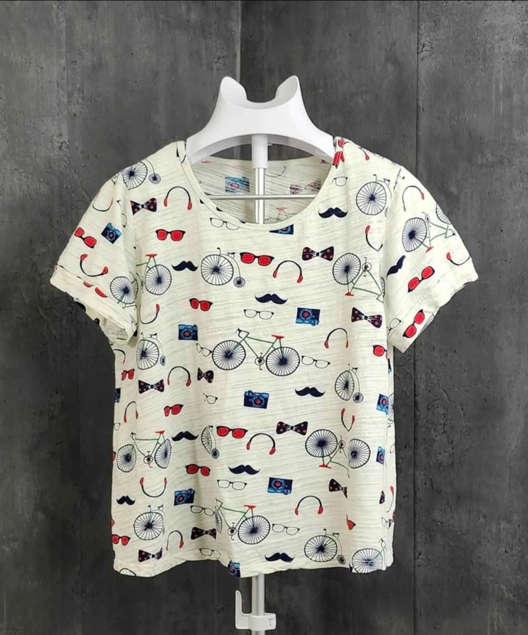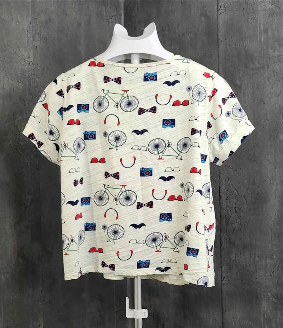 PRE-LOVED (Like New) Aimai Retro Print Shirt Scoop Neck Short Sleeve Ivory-colored for Women 1X Materials: Spandex, Viscose Measurements taken while laying flat (side to side): Arm Hole - 9" Bust/Chest (Pit to Pit) - 22" Biceps - 7.5" Collar/Neck - 27" Hem - 25" Length: 21" Neck to Shoulder - 3" Shoulder Width - 15" Sleeve Length: Outseam - 7" , Inseam - 2" Waist - 22" Note: This item was carefully inspected, cleaned, and neatly folded by me, then packed right after the photos were taken to ensure it reaches you in the same great condition as shown. From a non-smoking and pet-free home. This item can only be picked up on weekdays, not weekends. (Sorry.. no Interac or transfers. I only accept CASH for payment) ๐