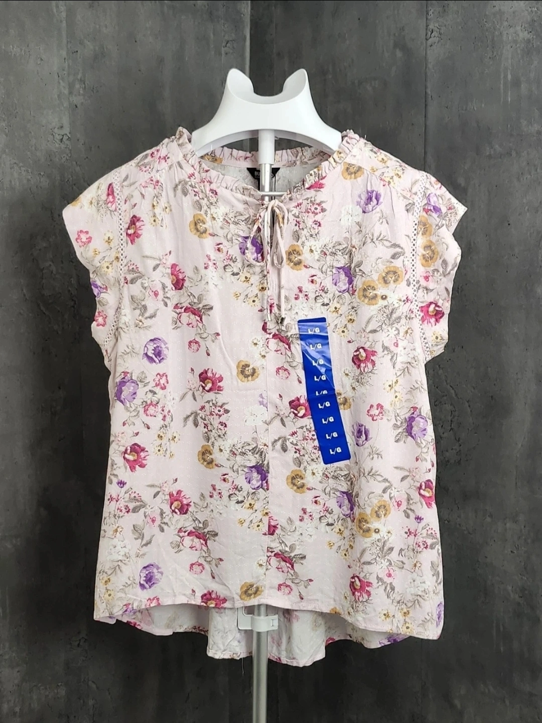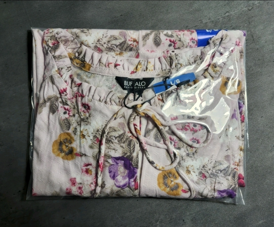 NEW (Tag Still On) Buffalo by David Bitton Notch Neckline Cap Sleeve Top Pink Floral for Women L Material: Viscose Measurements taken while laying flat (side to side): Arm Hole - 9.5" Bust/Chest (Pit to Pit) - 23" Collar/Neck - 24.5" (untied) Hem - 26.5 Length: Front - 24" , Back - 28" Neck to Shoulder - 3.5" Shoulder Width - 14.5" Sleeve Length: Outseam - 3" , Inseam - 1" Waist - 25.5" Note: This item was carefully inspected, cleaned, and neatly folded by me, then packed right after the photos were taken to ensure it reaches you in the same great condition as shown. From a non-smoking and pet-free home. This item can only be picked up on weekdays, not weekends. (Sorry.. no Interac or transfers. I only accept CASH for payment) ๐