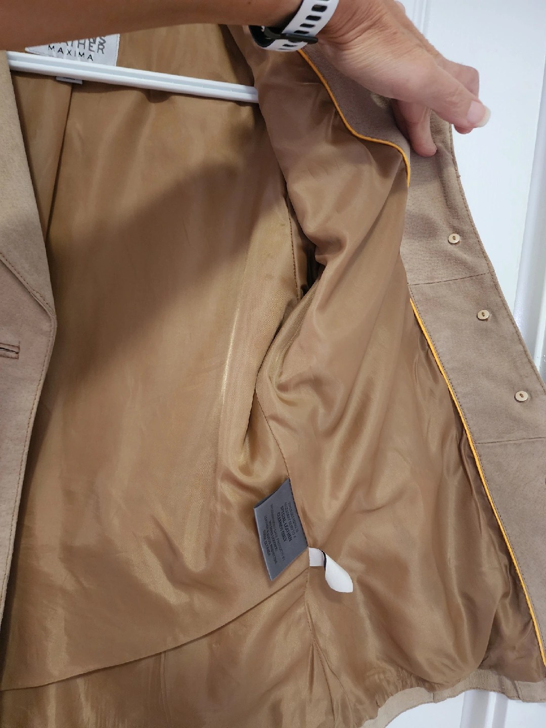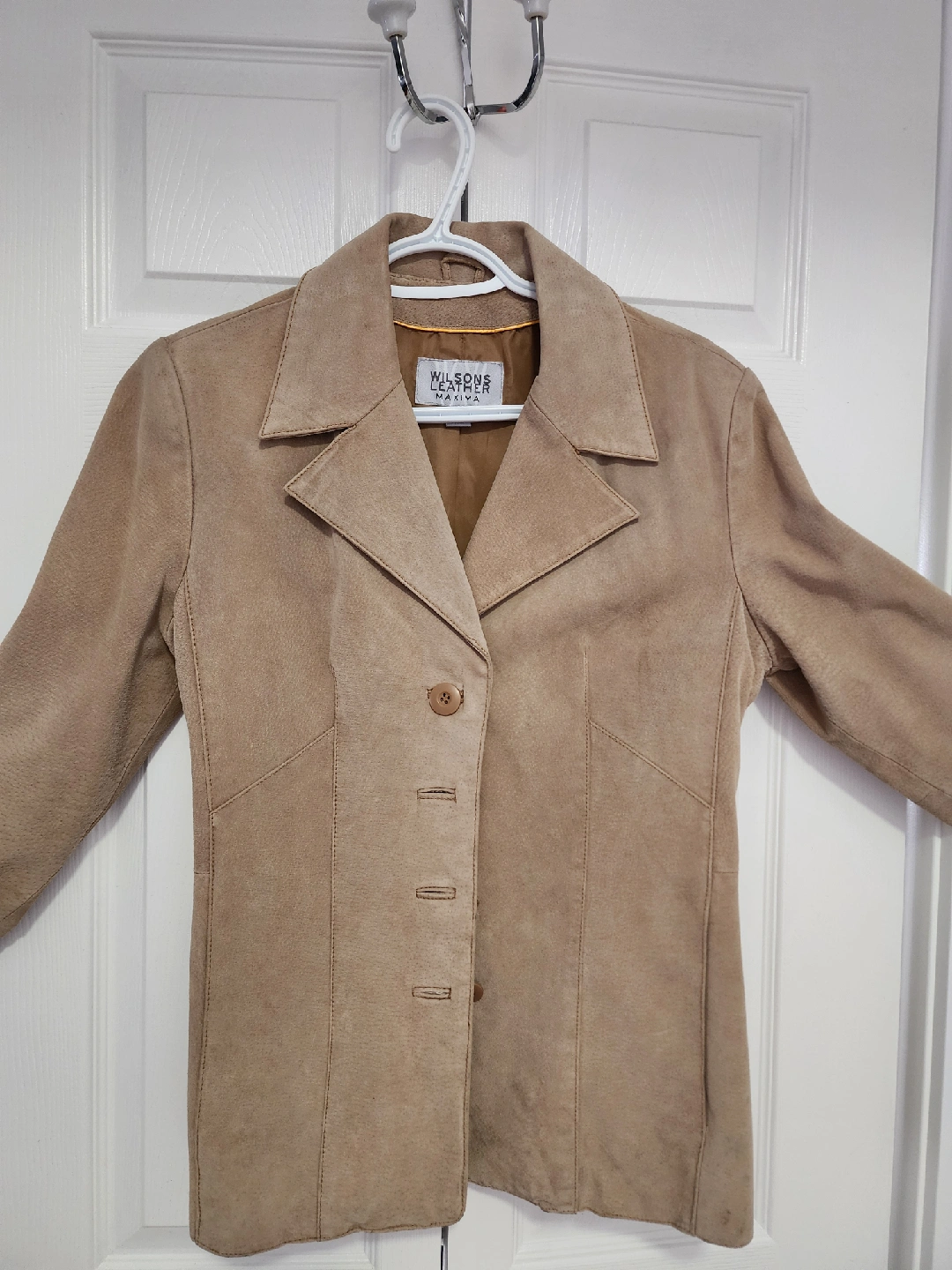 PICKERING!!! Here's a stylish Wilson's Leather Maxima jacket made from soft suede! It's a size small and features a classic button-down design. Perfect for adding a touch of vintage charm to your wardrobe. Fits great.