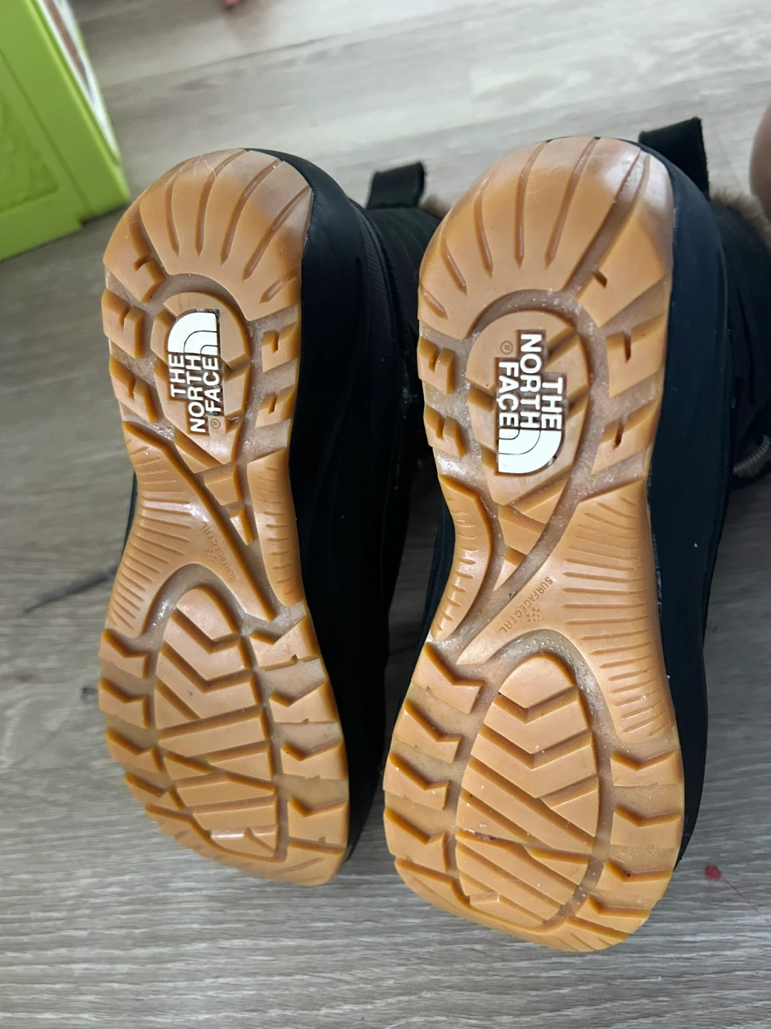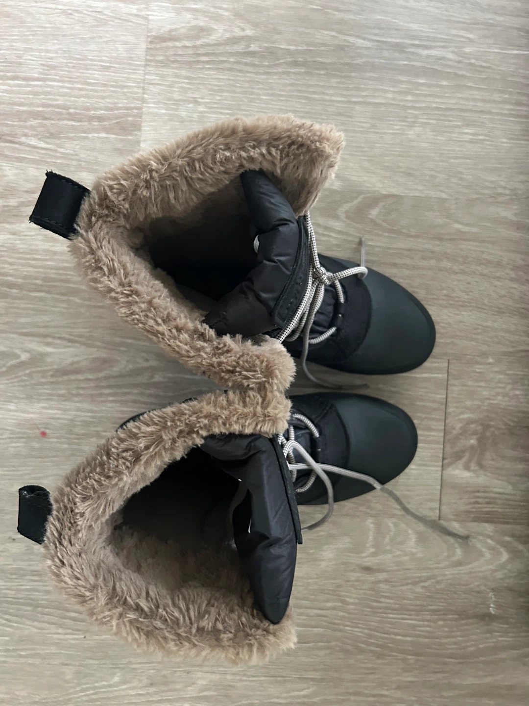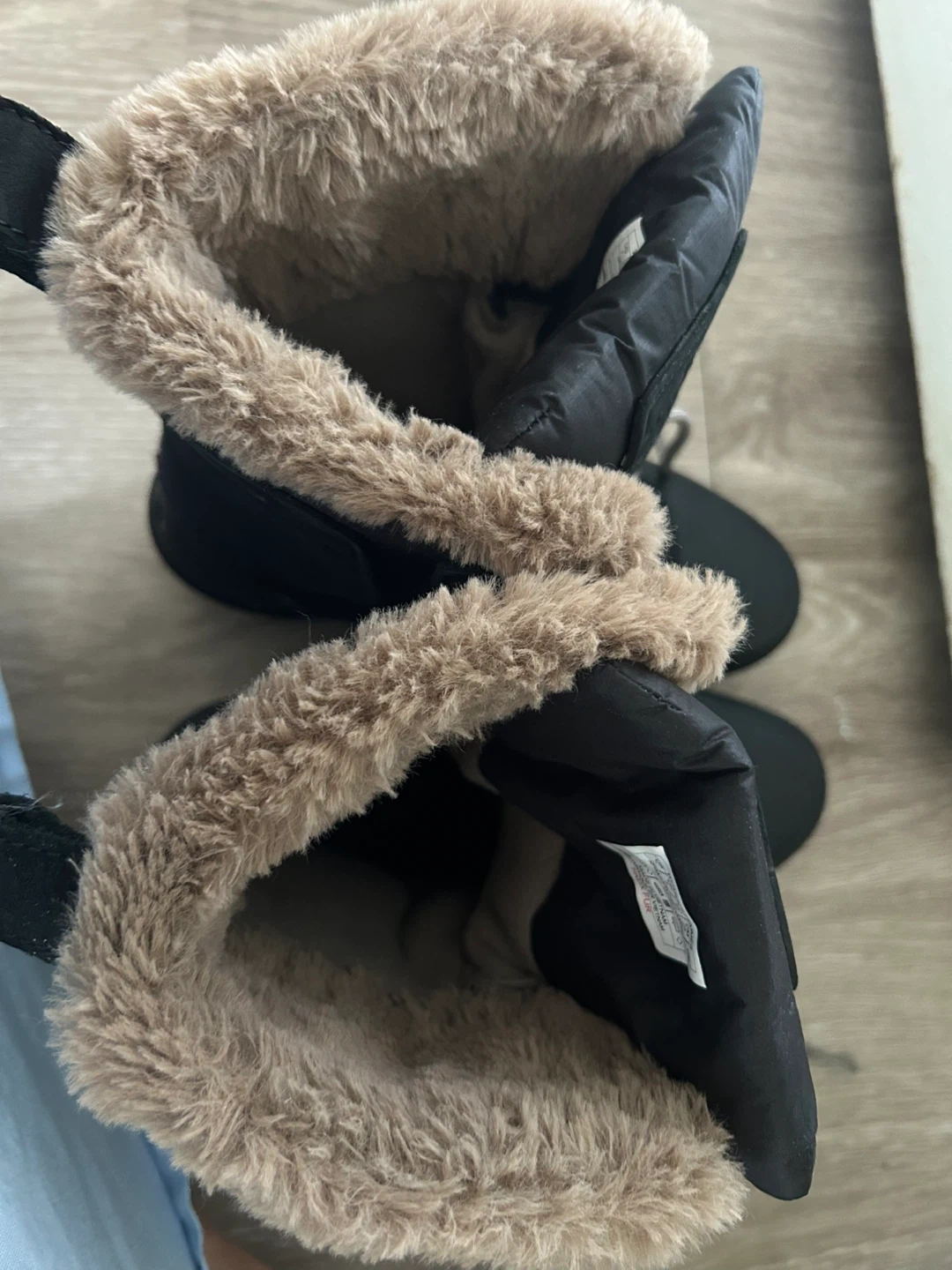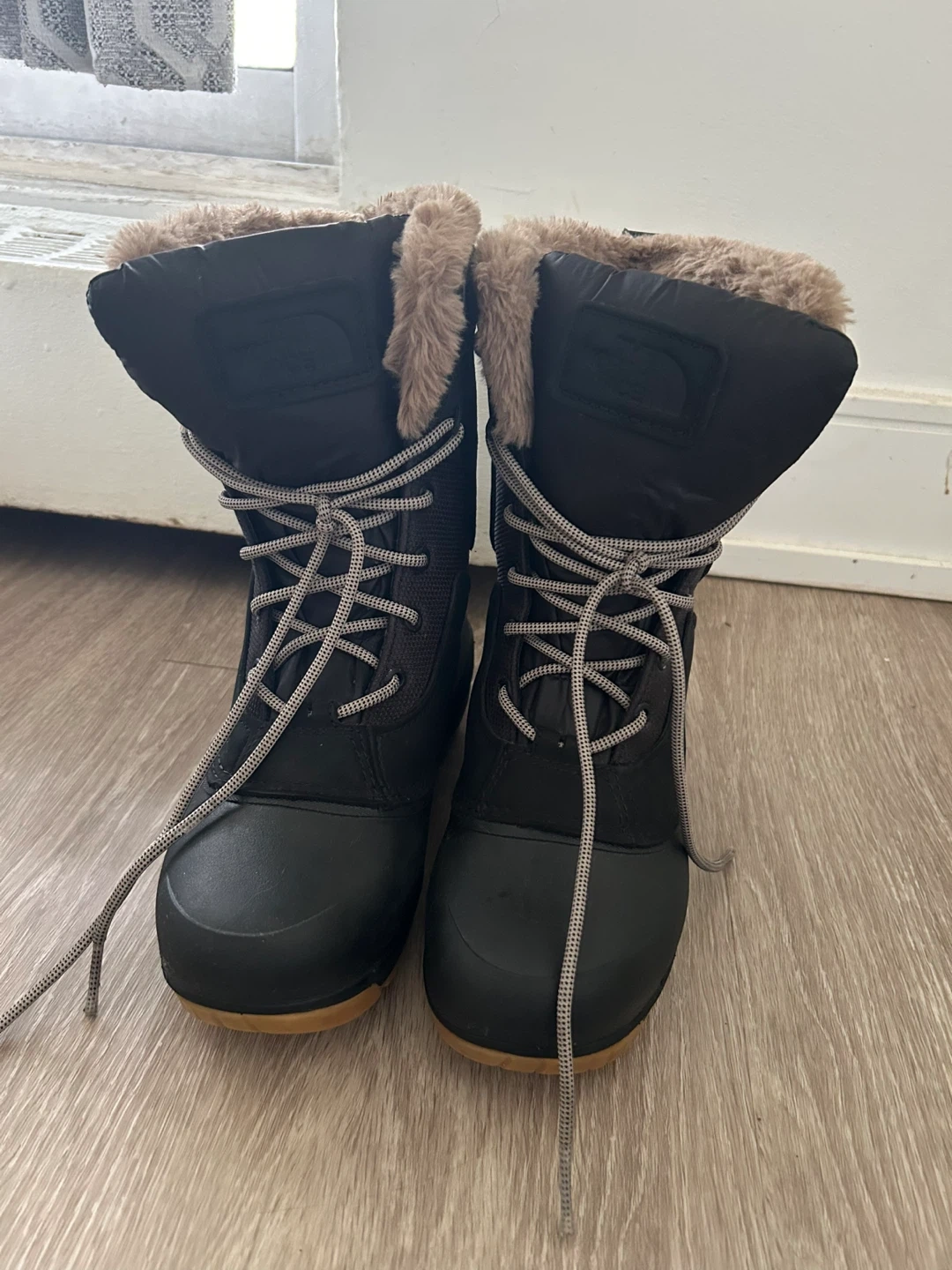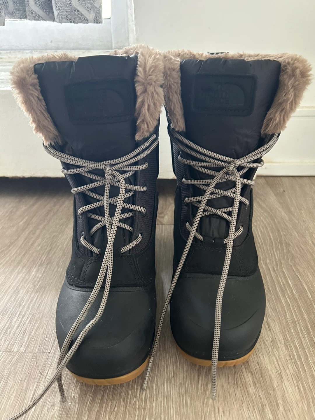 The boots are waterproof and insulated, designed for cold weather. They feature a durable rubber shell bottom, a lace-up closure, and a faux-fur collar for warmth and comfort. The sole is made of a durable rubber for traction