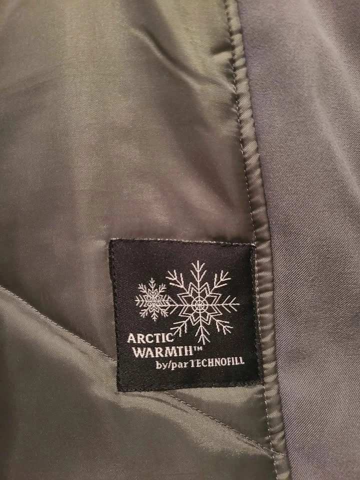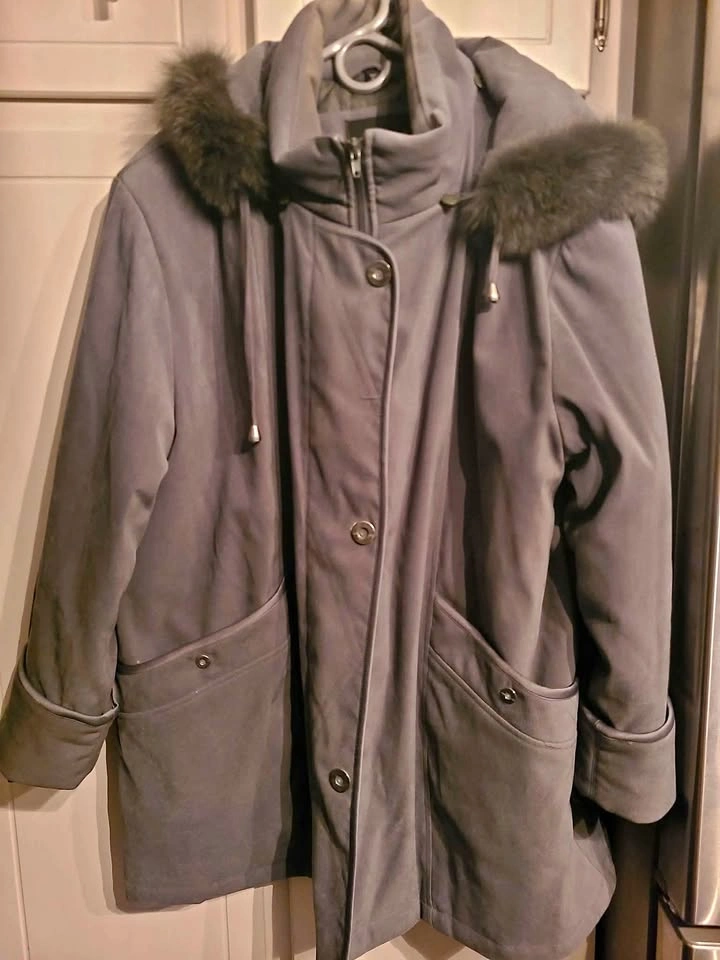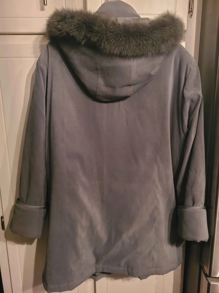 The color doesn't show up well in the pictures, but it's dark green. It has a zipper closure as well as three snap buttons. The two large pockets also close with snap buttons. The hood is removable. Beautiful warm coat in excellent condition. Pick up near Lou's Grill in Abbotsford.