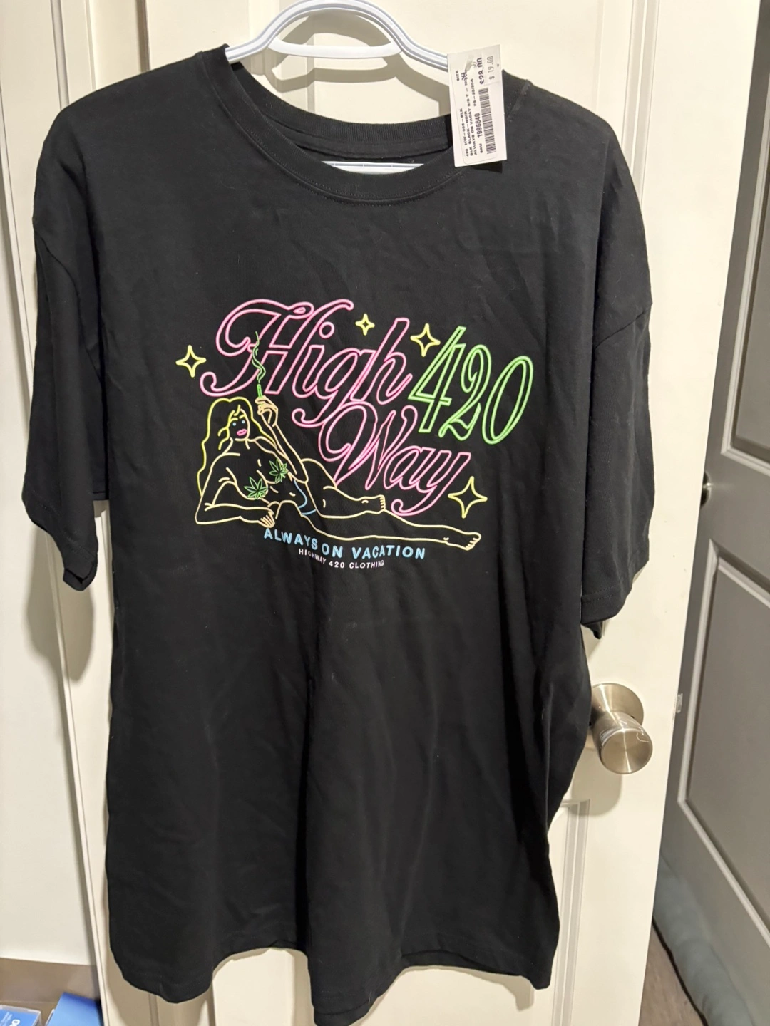 Selling a black t-shirt from Highway 420 Clothing. It features a graphic design with the words "High 420 Way" and "Always on Vacation". The tag shows it was originally $19.00