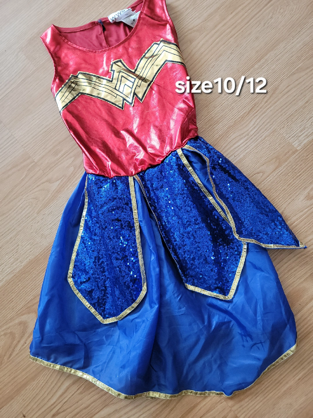 Wonder Woman dress in size 10/12! The dress is red and blue with gold accents and the Wonder Woman logo on the front. Perfect for dress-up or Halloween!