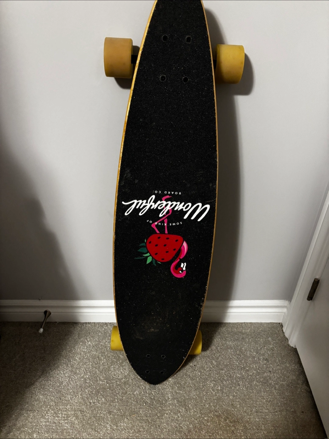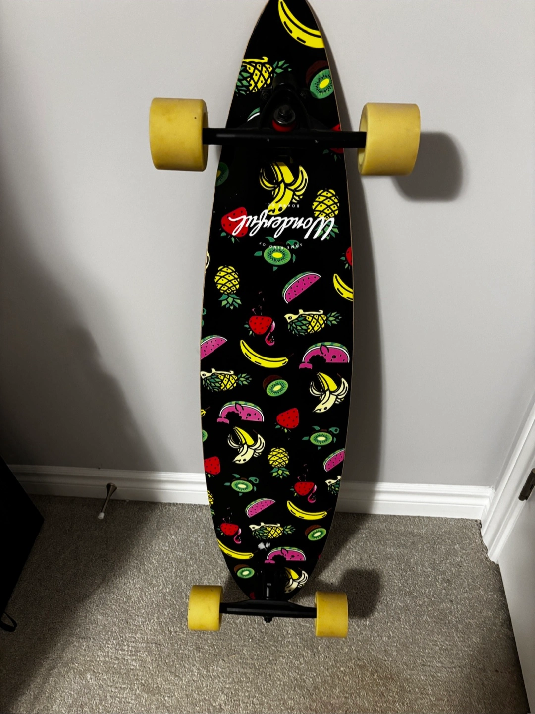 Selling a skateboard from Wonderful Board Co. It features a fun fruit pattern on the bottom. Great for cruising around the neighbourhood! Used it a bit during Covid lockdown. But lost my interest in it.