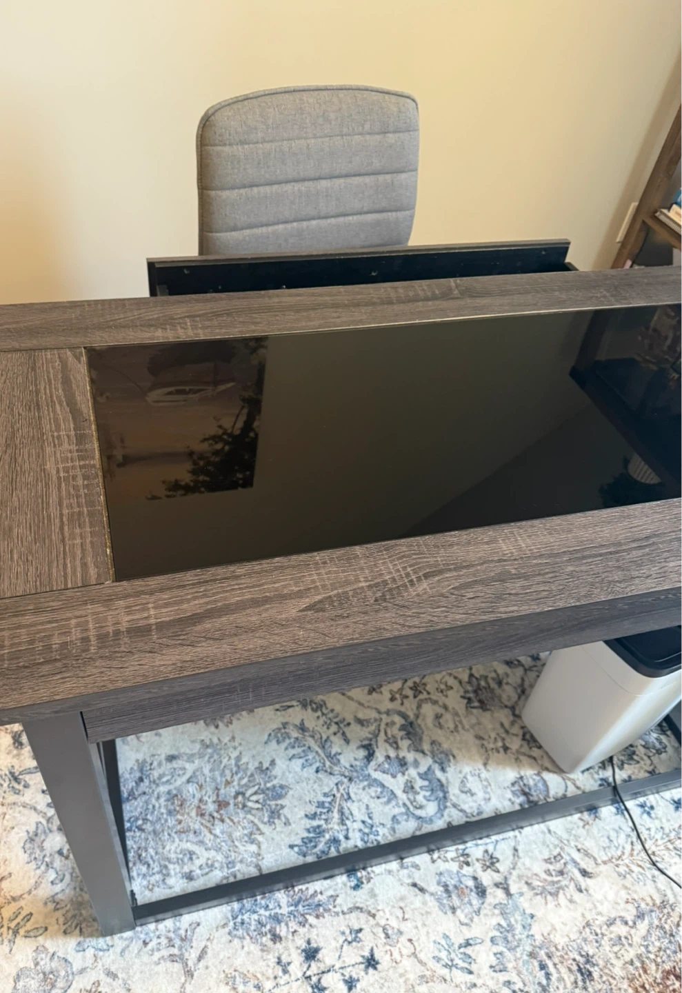 Selling a wood desk with a glass top. It's in great condition and would be perfect for a home office or study space. The dark wood frame gives it a modern look, and the glass top is easy to clean. The desk is sturdy and well-built