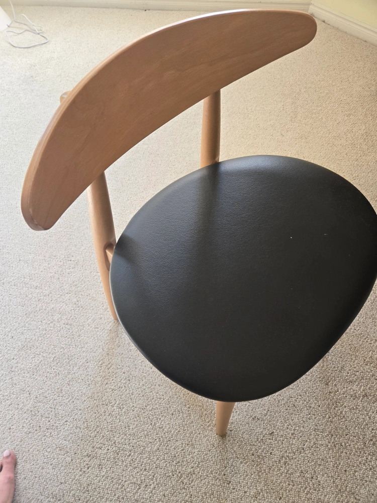 Selling a stylish dining chair with a natural wood frame and a black leather seat. It's in great shape and would look fantastic in any dining room or kitchen. The chair features a curved backrest for added comfort and a sleek, modern design