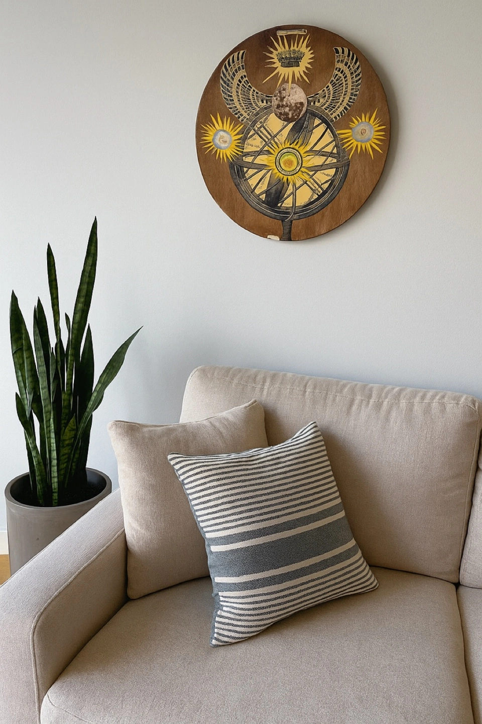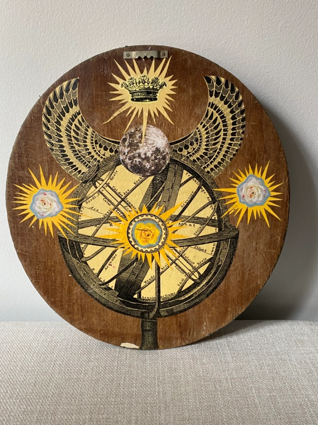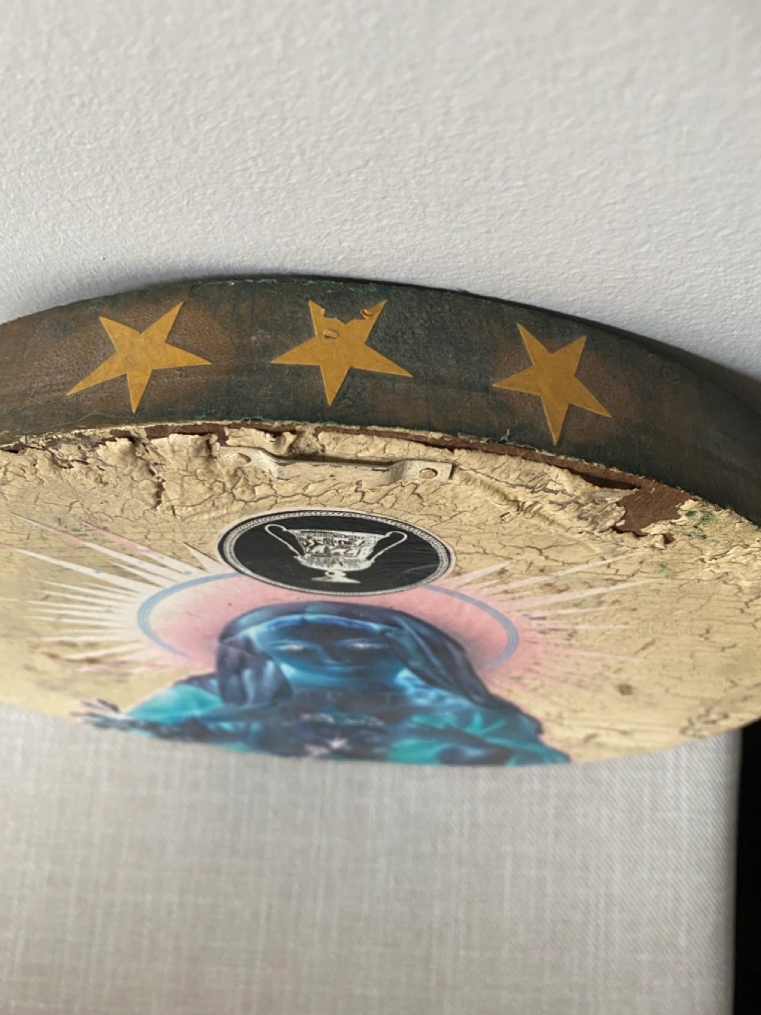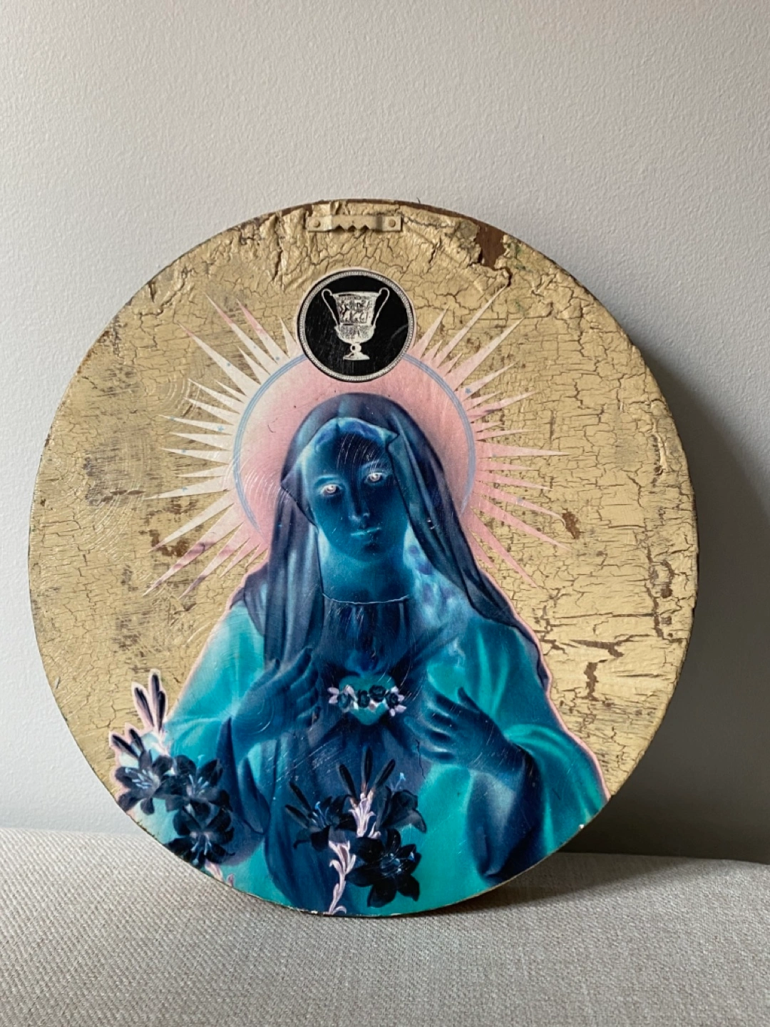 Round solid heavy wood piece with reversible sides. I had the Mary side hanging over my bar area… Collage images + lacquered coating on top. Hooks to hang on either side. About 10” diameter