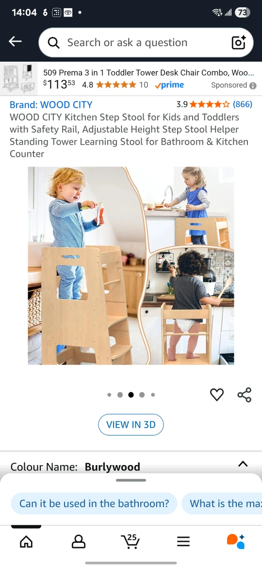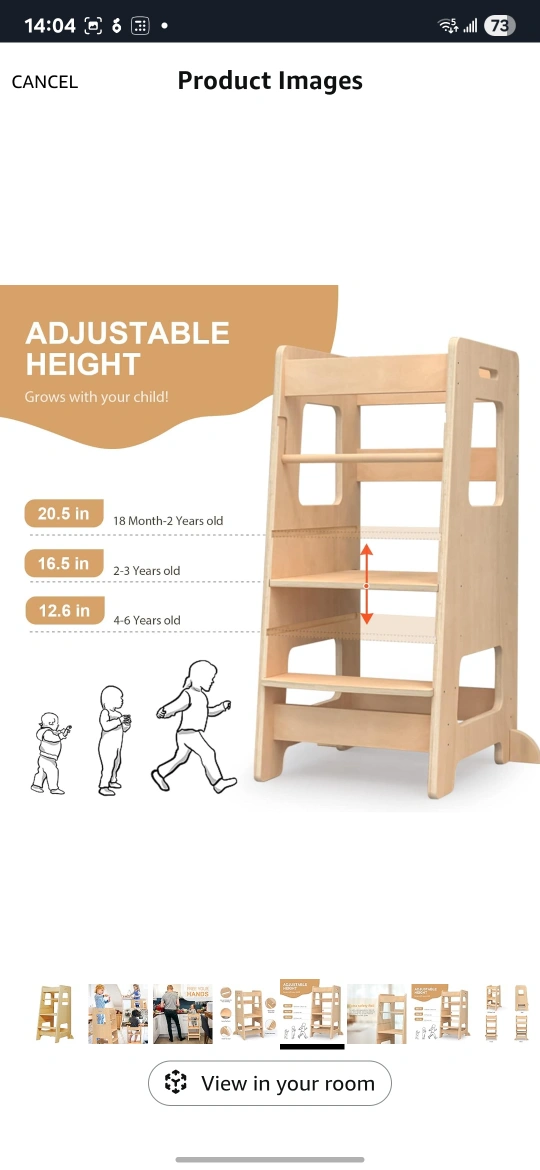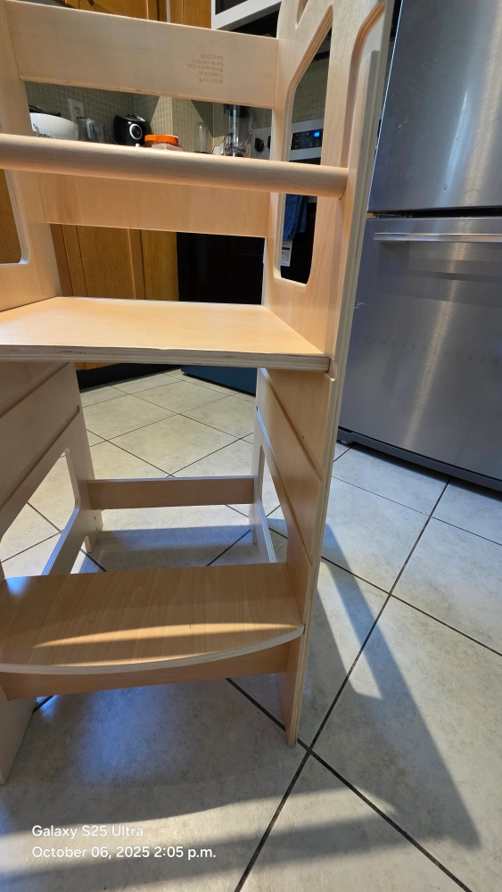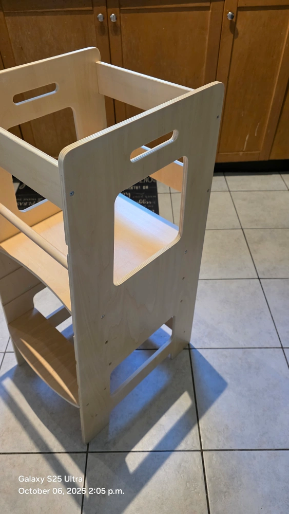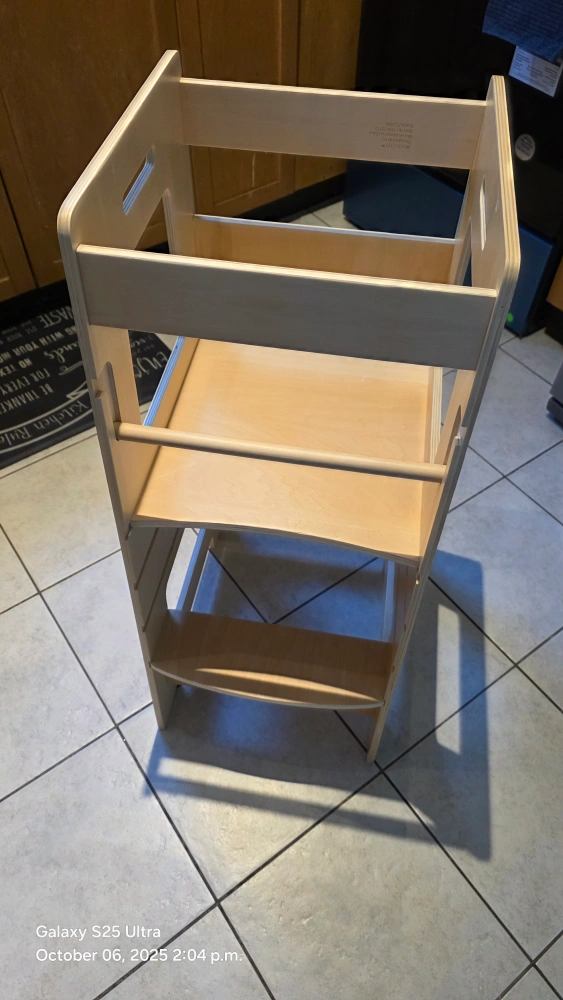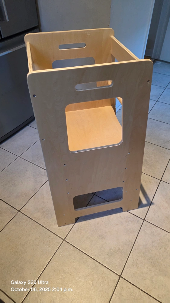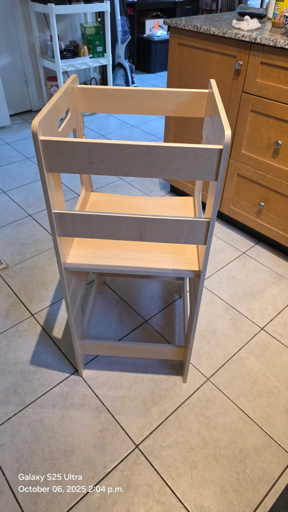This kitchen step stool is perfect for kids and toddlers! It has a safety rail and adjustable height. It's a great learning stool for the bathroom or kitchen counter. The colour is Burlywood. Originally bought for $113.53 minor scratches in the body. solid stucture. used for only 4 months. our baby does not like it