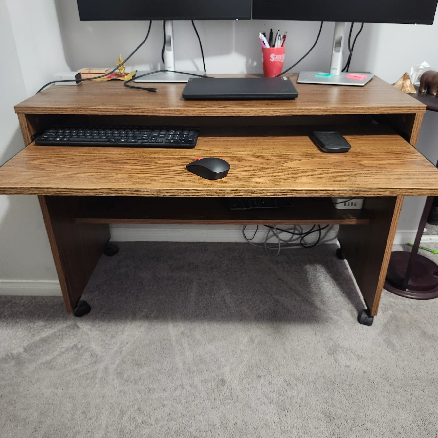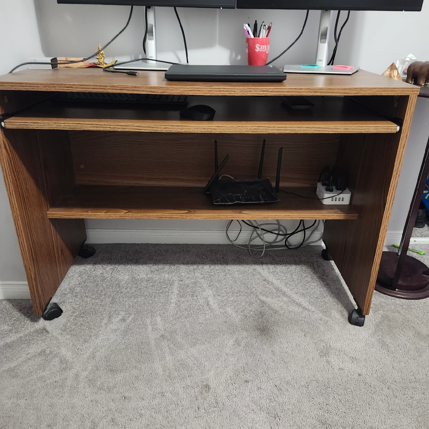 Selling a wood computer desk with a handy pullout keyboard tray. It has a natural wood finish and is in good condition. Perfect for a home office or study space!