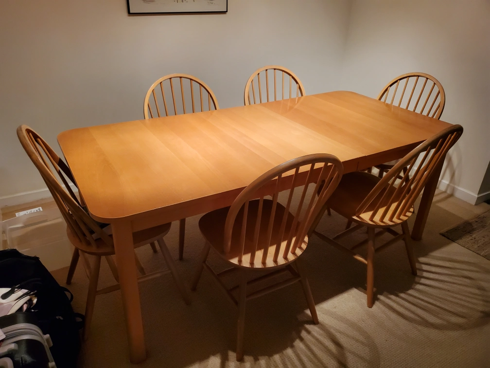 Selling a Beech veneer wood dining table with six matching solid wood chairs. It's in great shape and perfect for family dinners or gatherings with friends. The set is sturdy and has a classic design that would fit well in any dining room!