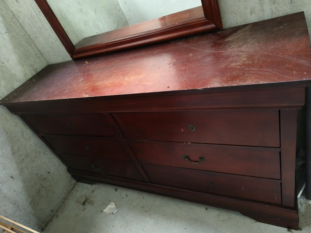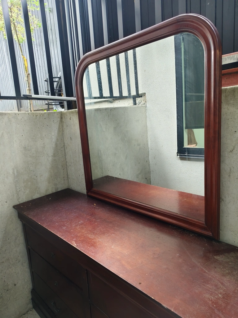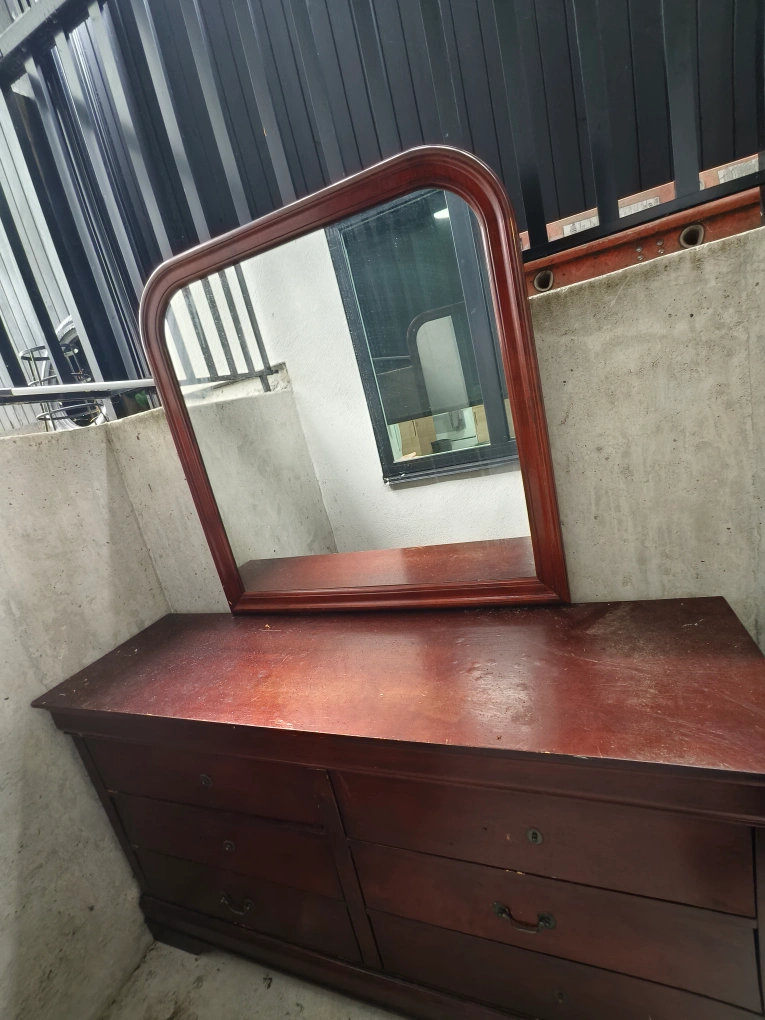 Here's a lovely wood dresser with a mirror. It has a classic design and a rich, warm colour that would look great in any bedroom. It has some signs of use, but it is still sturdy and functional. Perfect for adding storage and style to your space pick up only