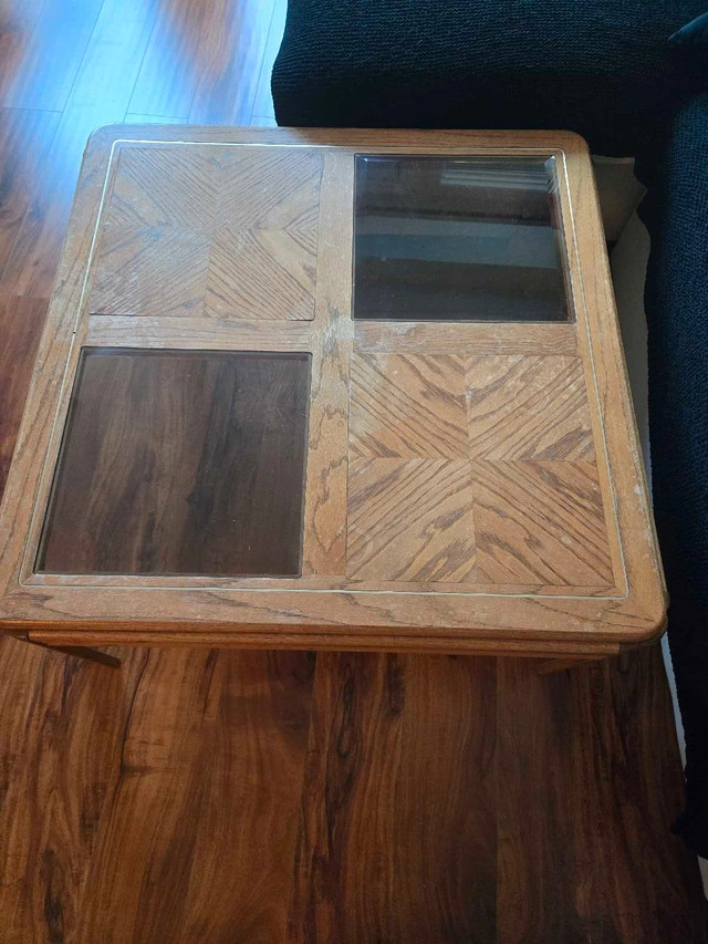 This solid wood end table features a classic parquet design with glass inserts, perfect for adding a touch of elegance to any living space. This item has some wear and tear, as the pictures indicate. If the ad is up, it's available!