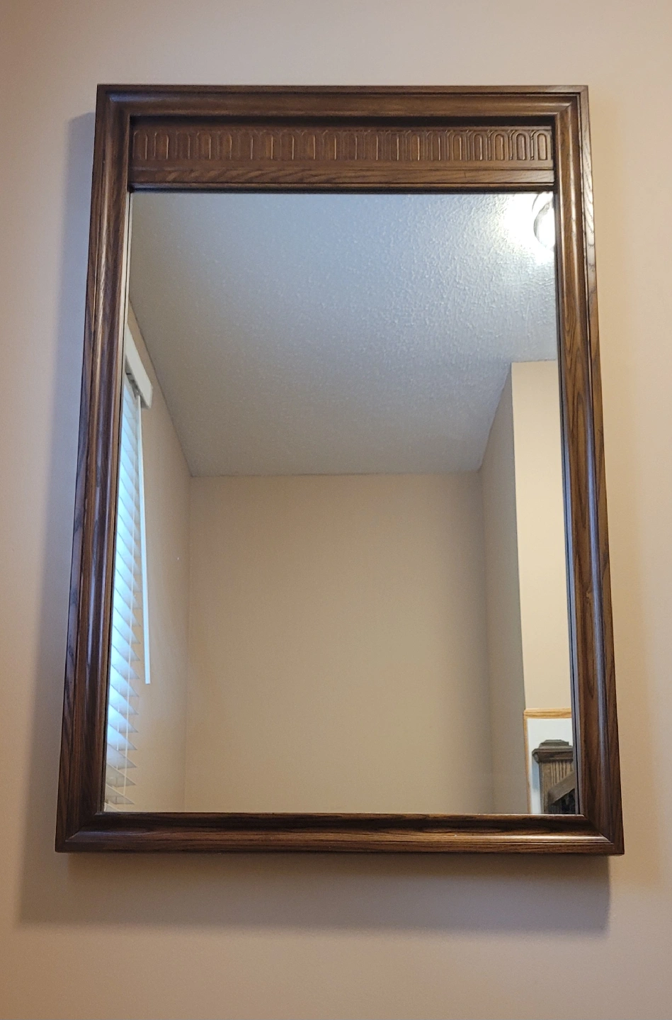 A lovely wood-framed mirror, perfect for adding a touch of warmth to any room! It's in great condition and ready to find a new home