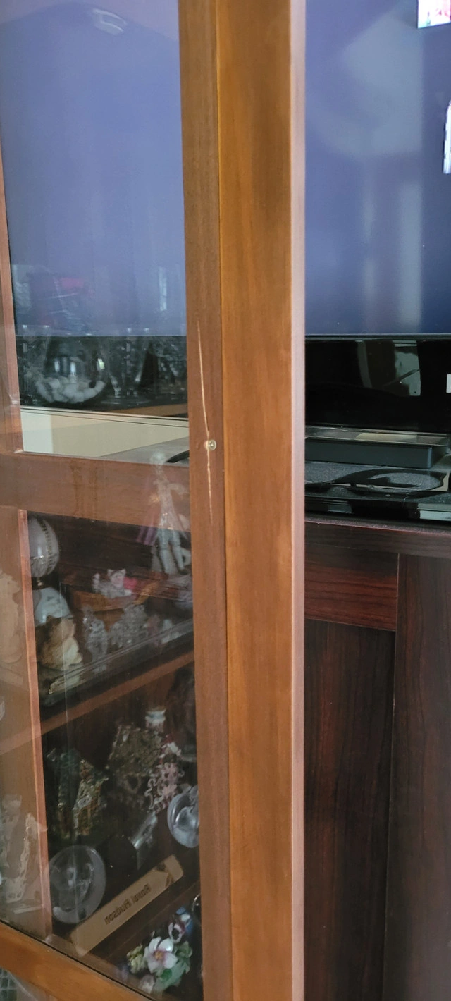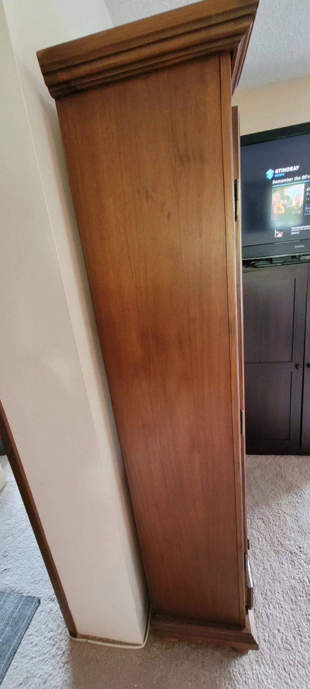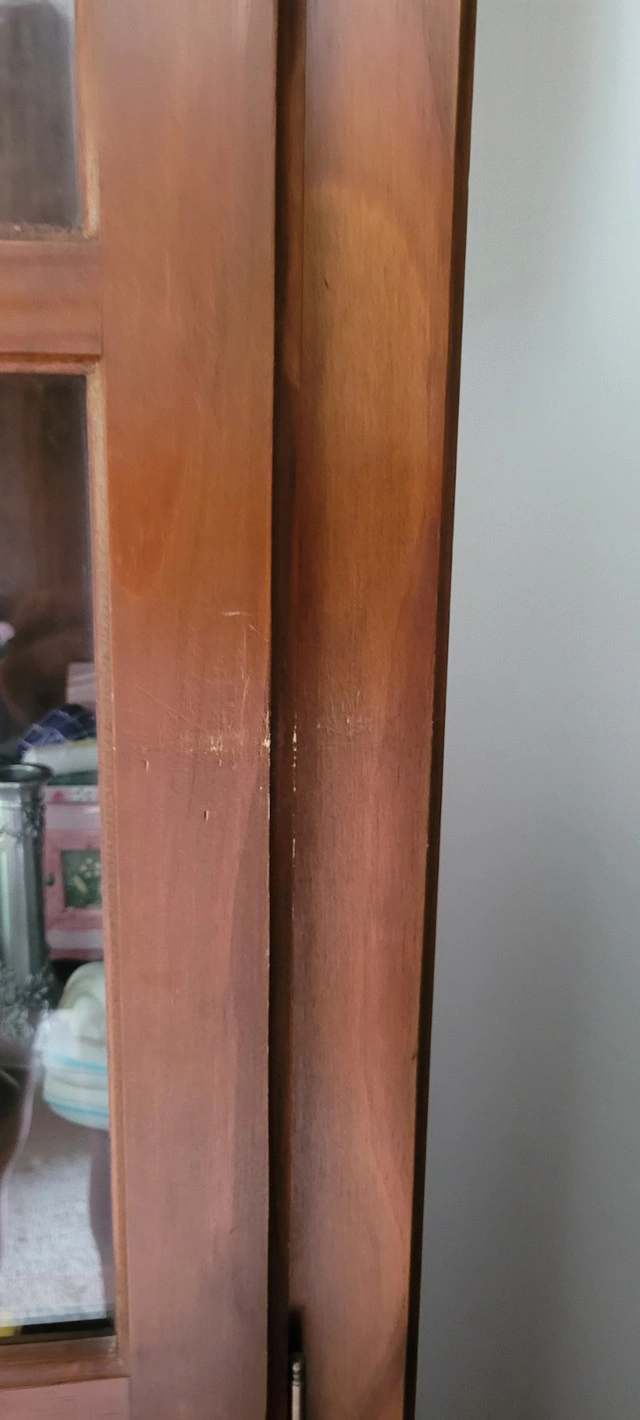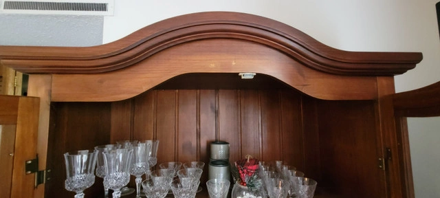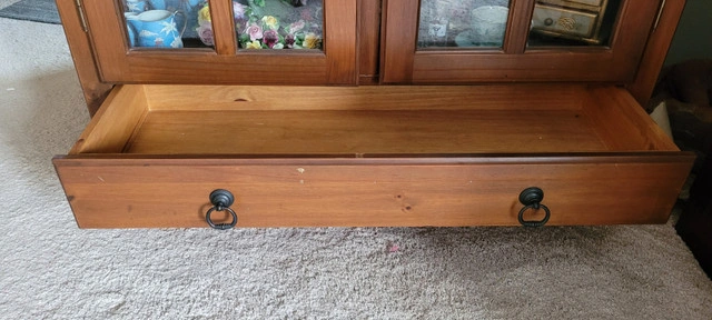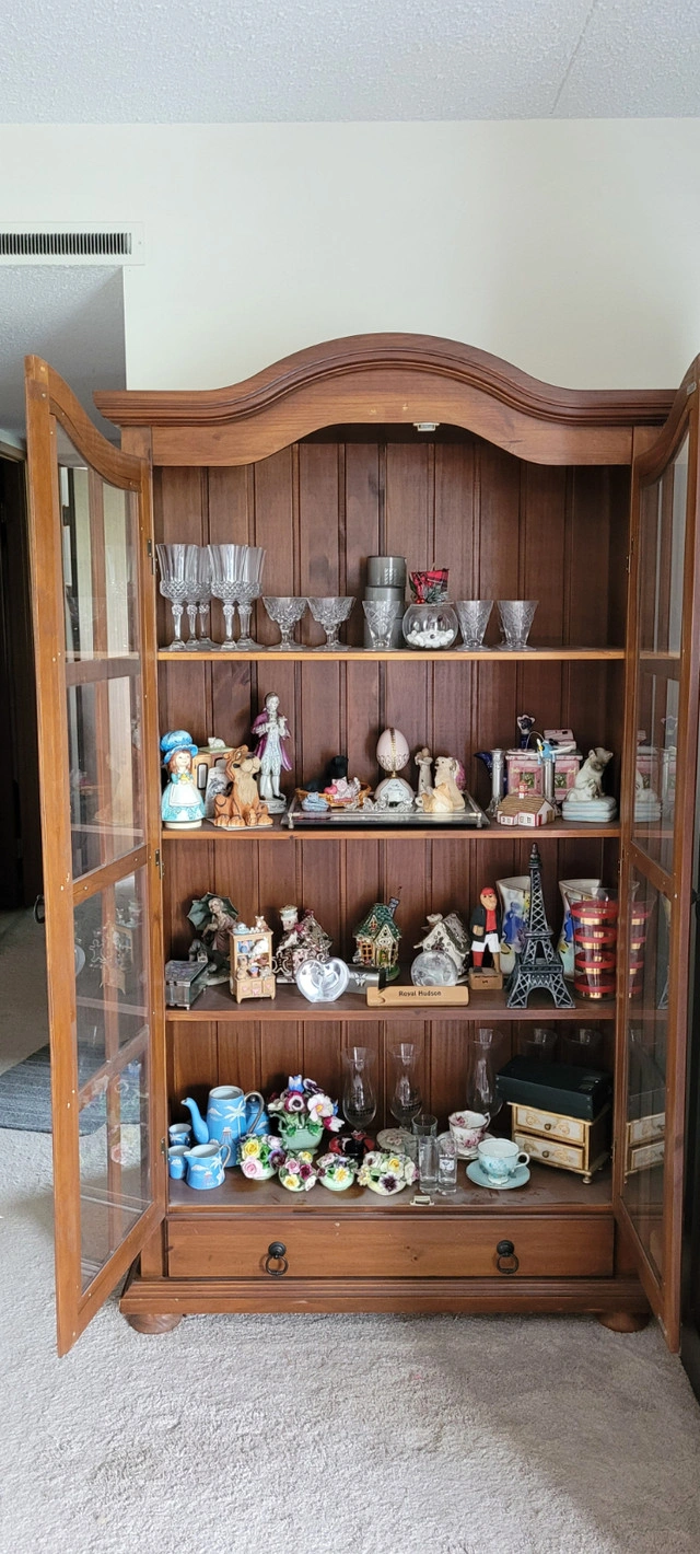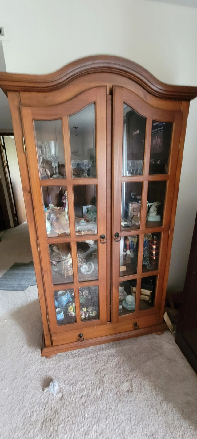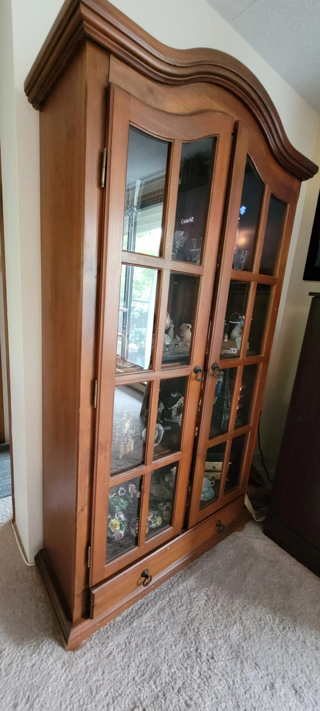 Beautiful solid wood glass-front cabinet with arched top. Dimensions: 42" W × 15.5" D × 75.25" H. Double doors with glass panes and sturdy wood frame. Shelving inside, perfect for displaying china, collectibles, or glassware. Classic design with curved crown top and lower drawer. Condition: a few light scratches on the sides, otherwise very solid and in good condition. This is a versatile piece that works as a china cabinet, curio cabinet, or display case. Reasonable offers accepted. Pickup only.
