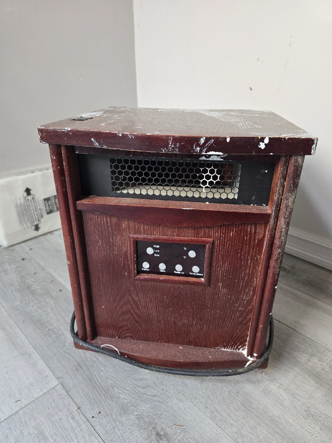 Selling a used electric space heater with a wood-look finish. It has a control panel with buttons for power, timer, temperature up, and temperature down. Settings include high, low, and eco. It shows signs of wear.