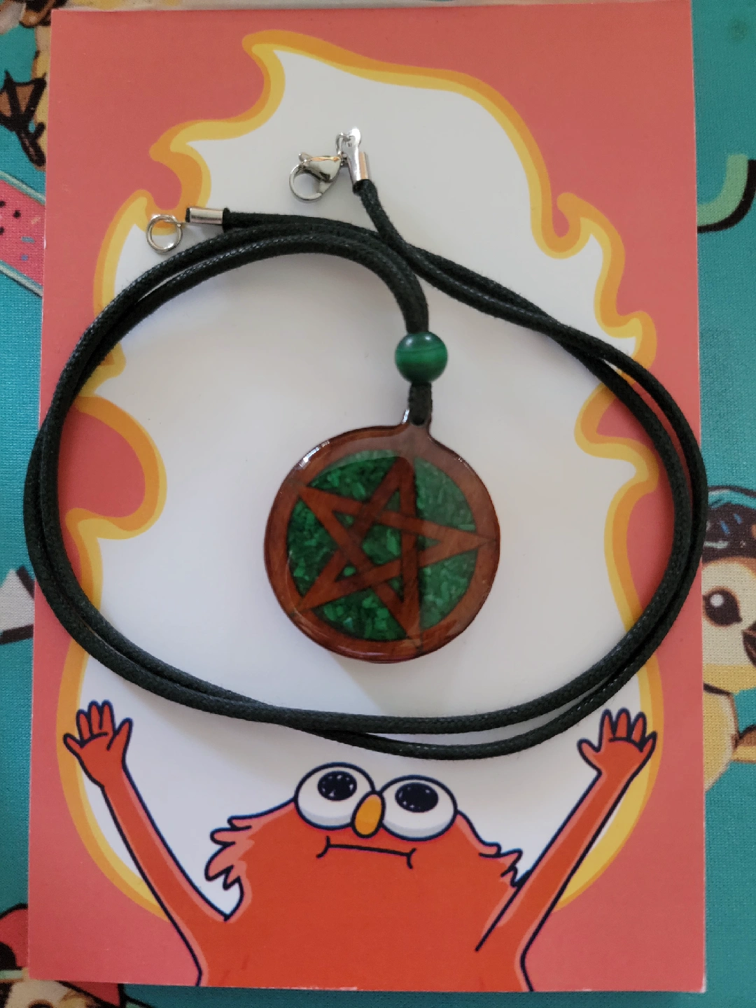 This is a unique wooden pendant necklace with malachite, featuring a pentagram design! It's in great condition and would make a lovely addition to anyone's jewelry collection. The necklace length is 12inches from the bead at the top of the pentagram. It is handmade by the owner of TempleofAwen, an Etsy shop. Check their store out! It's super cool. https://www.etsy.com/ca/shop/TempleofAwen Exact link to this necklace. The necklace length is different in my posting since I asked it to be custom made. https://www.etsy.com/ca/listing/1259124394/malachite-pentagram-wood-pendant Open to negotiating the price; please reach out. Thank you for taking a look at my listing! Have a wonderful day.