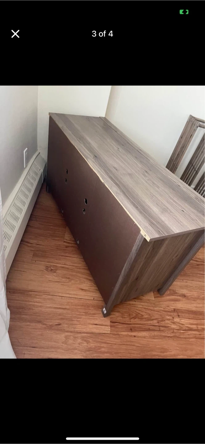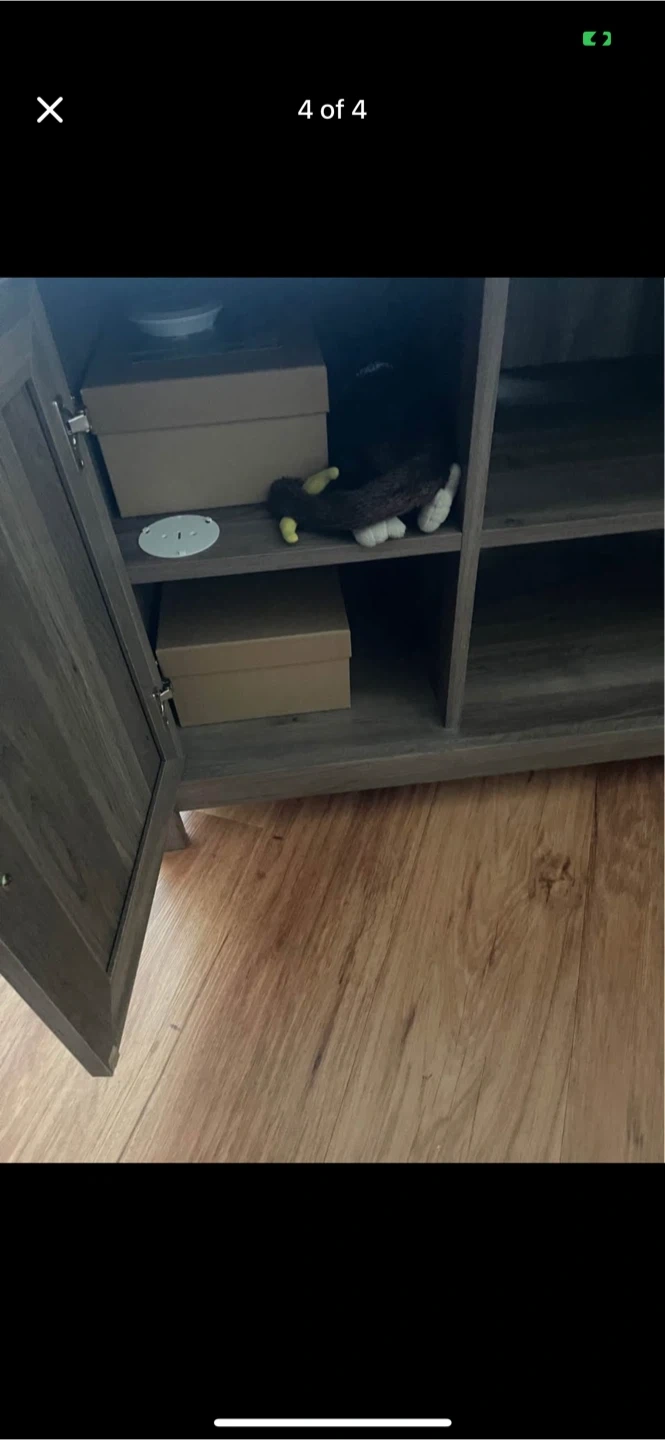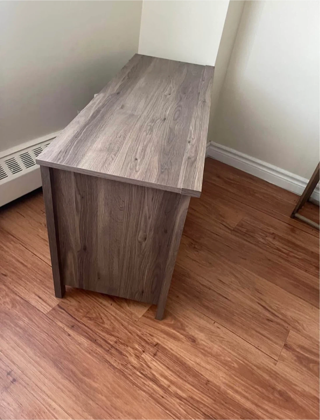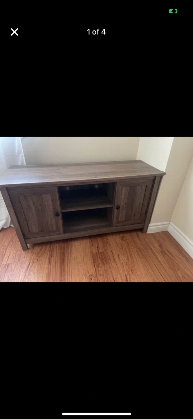 Selling a wood TV stand or media console. It features a light brown wood grain finish and includes storage space with doors and open shelving. Great for organizing your entertainment area