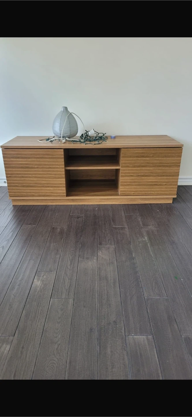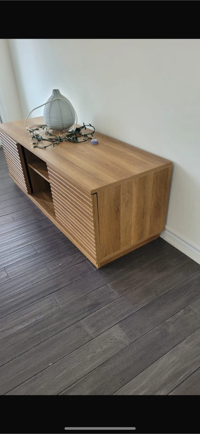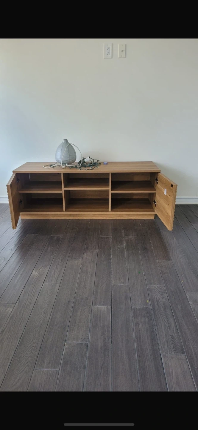 Here's a wood TV stand that would be great for a media console in your living room or entertainment space. It has a natural wood finish and shelving inside for storage. It's in good condition and ready for a new home!
