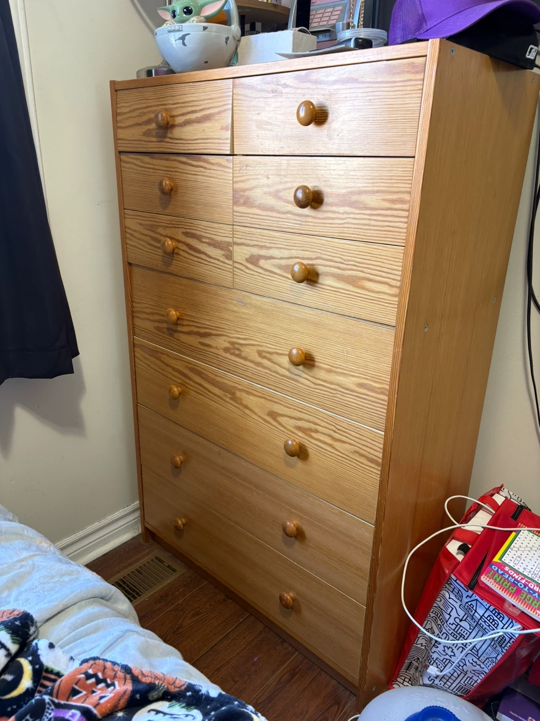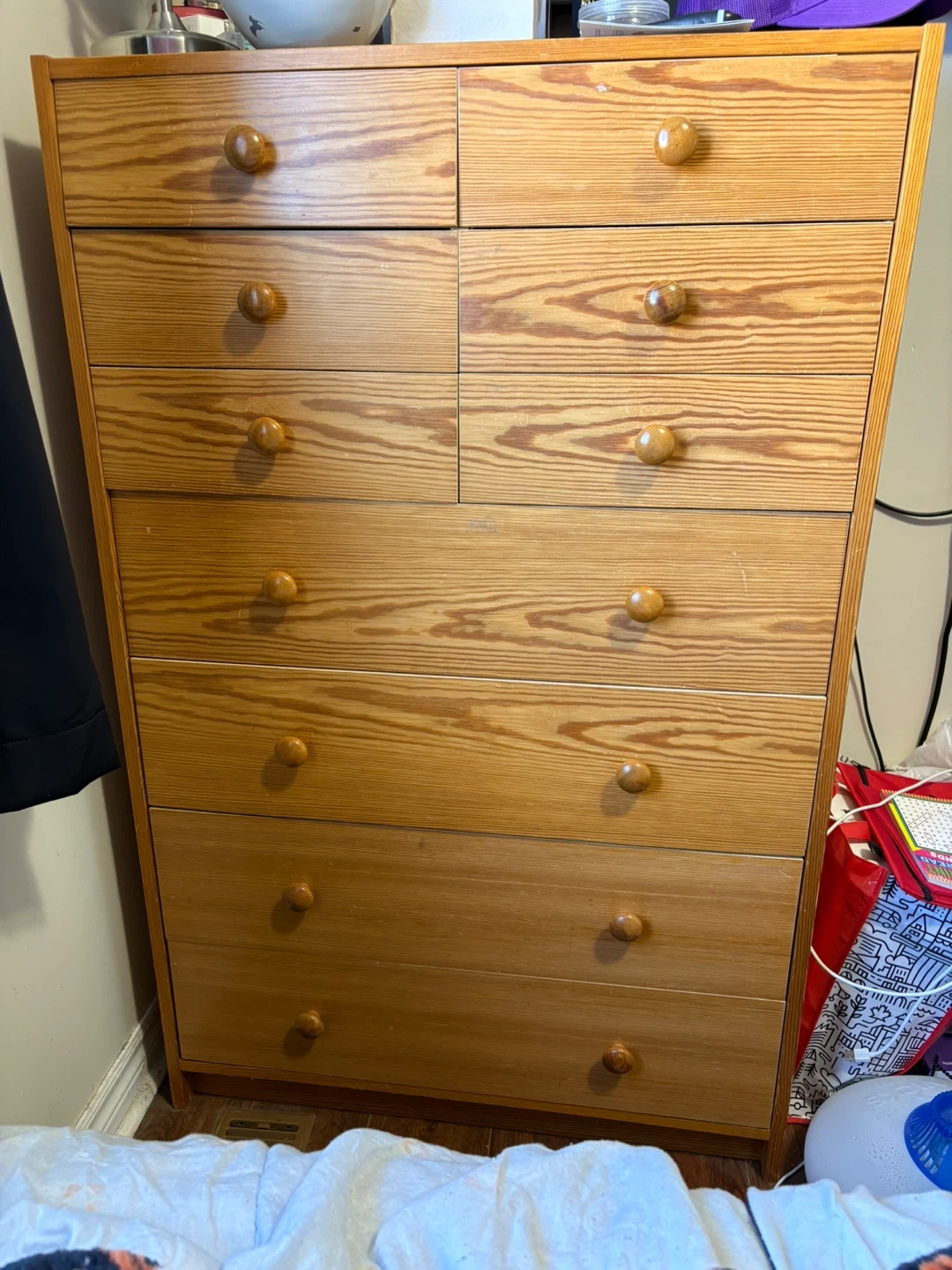 Wooden dresser with 10 drawers! It's perfect for adding some extra storage to your bedroom or any other space in your home. The natural wood grain gives it a warm and inviting look. It has a few signs of use but it's in good condition. 6 small drawers and 4 larger drawers. 49.5" H x 31.5" W x 16" D Pickup and cash only. NO HOLDS