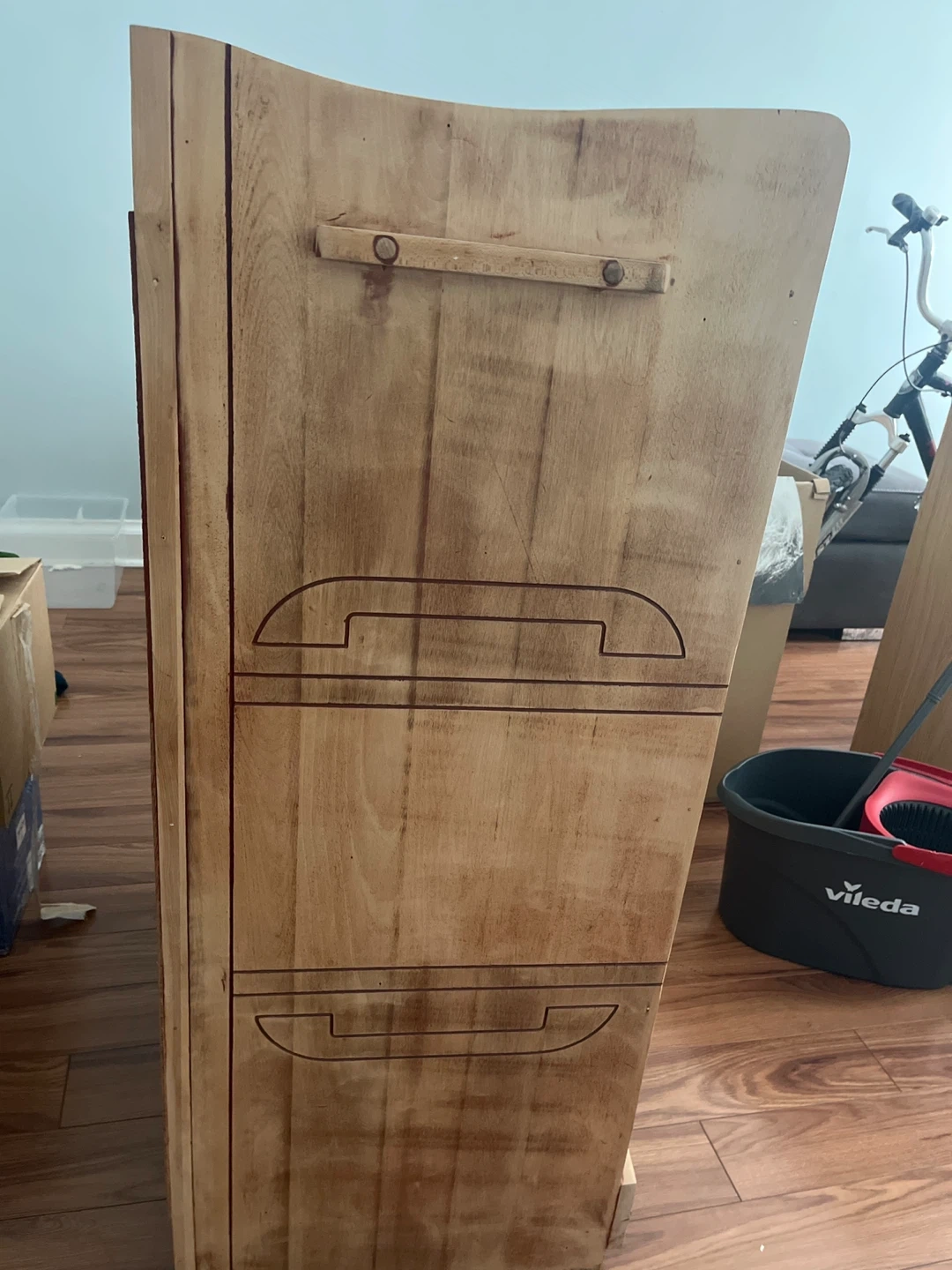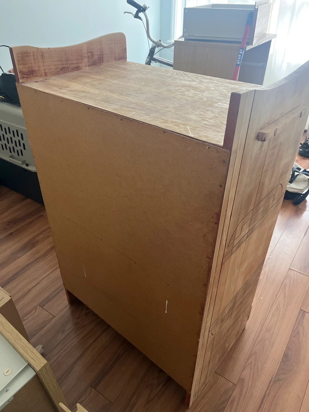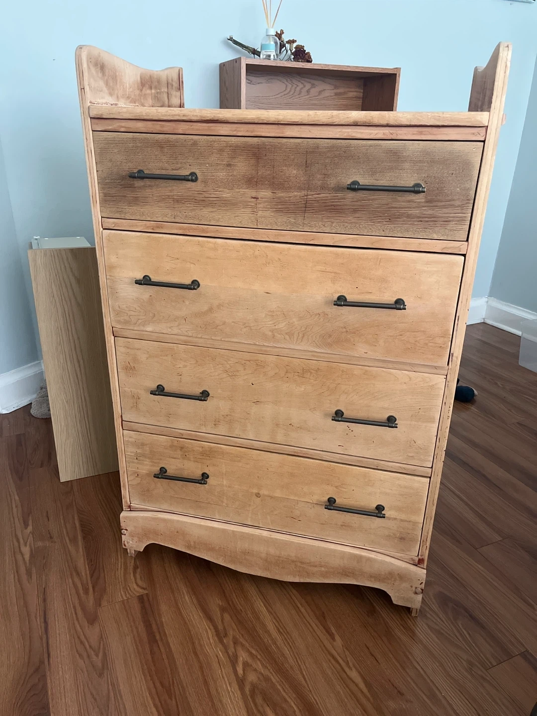 Handcrafted wooden 4-drawer dresser. It has a unique design and would be great for adding some storage space to a bedroom or any other room in the house. It has some wear, but it's still sturdy and functional