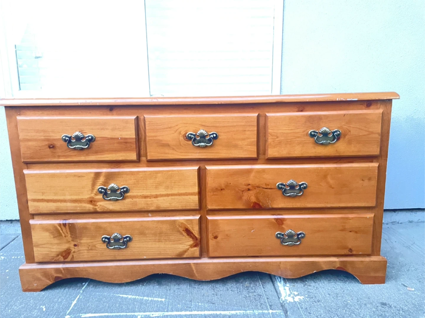 wooden dresser with 7 drawers. It's a great piece for adding storage to any bedroom or living space. The dresser has a classic design with decorative metal handles. It's in good used condition Very heavy. Need 2-3 people for pick up. Pick up from ground level.