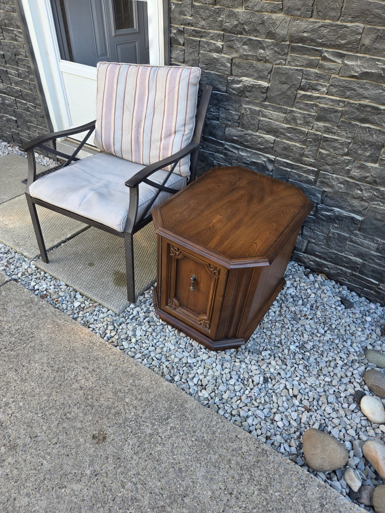 Selling a lovely wooden accent table! It features a door for storage and has a unique, decorative design on the front. It's in great condition and would make a nice addition to any room