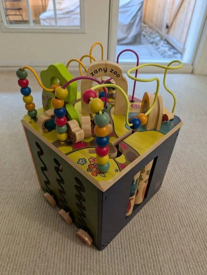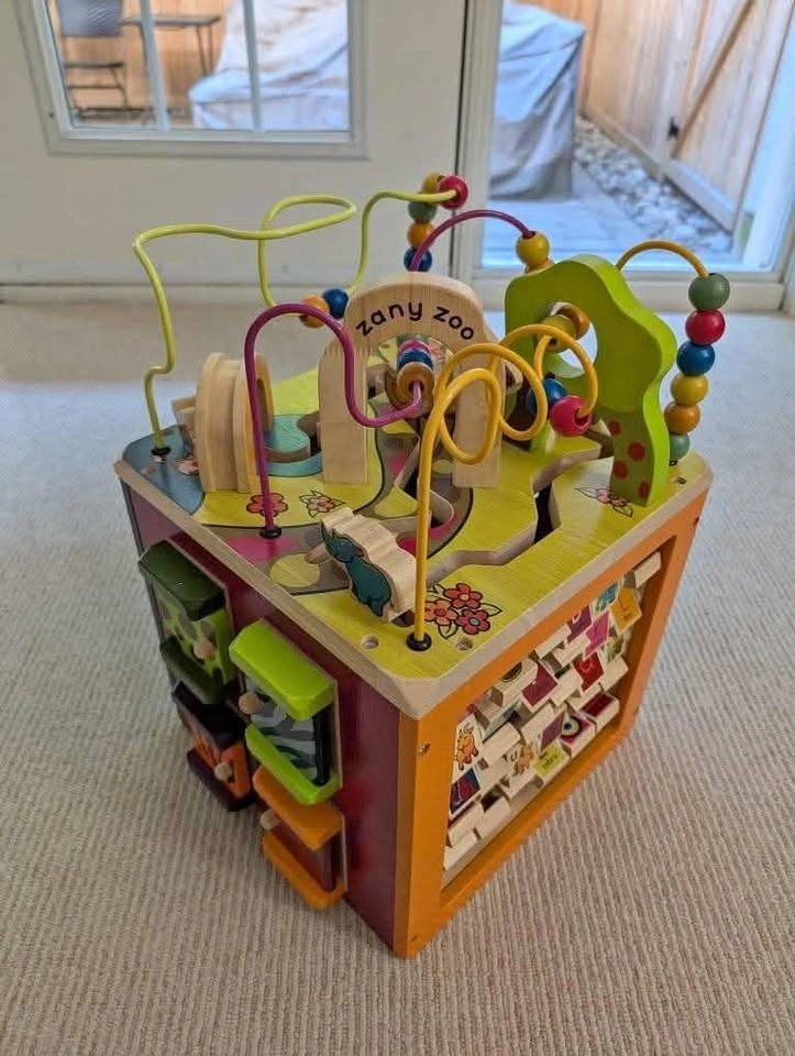 Wooden Activity Cube: Explore five sides of fun and learn about a ton of animals with our wooden activity center! Fun Features: Discover alphabet tiles, a bead maze, zigzag tracks, peek-a-boo doors, and more! Smooth & Sturdy: This durable activity cube is made with solid wood and features rounded corners. Developmental Toy: Exploring all of the tiny hands-friendly features improves fine motor skills. Age: The Zany Zoo is recommended for toddlers 1 year + Pikcup in Little Italy.