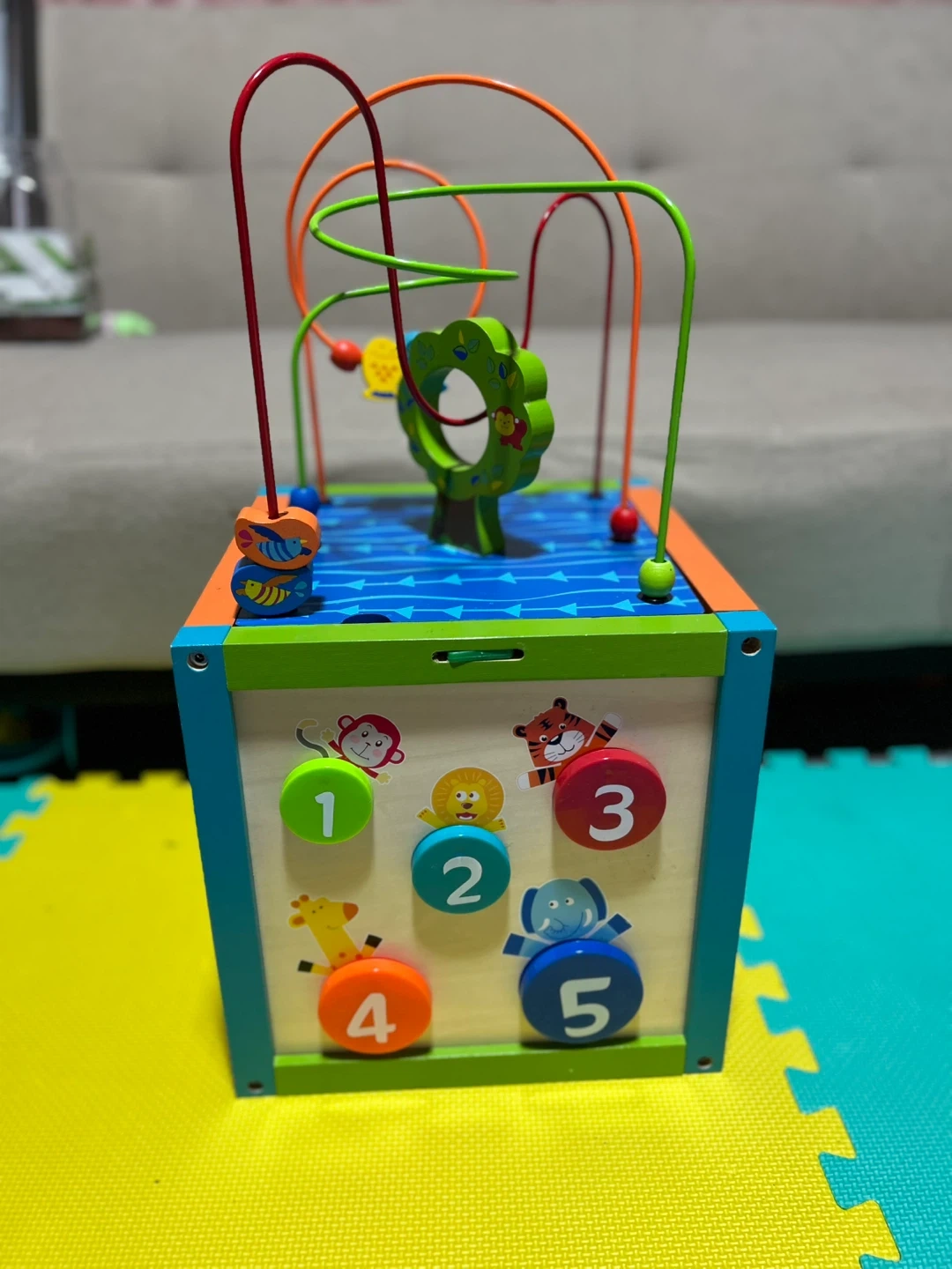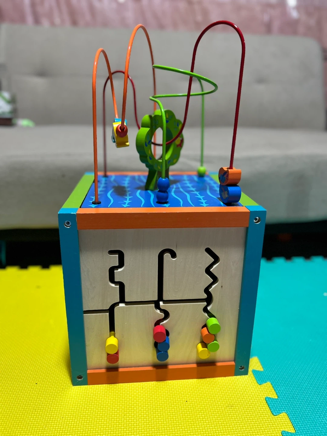 This wooden activity cube is a great toy to keep little ones entertained! It features a bead maze on top, plus different activities on each side of the cube, including gears, number puzzles, and shape sorters. Perfect for developing fine motor skills and problem-solving skills