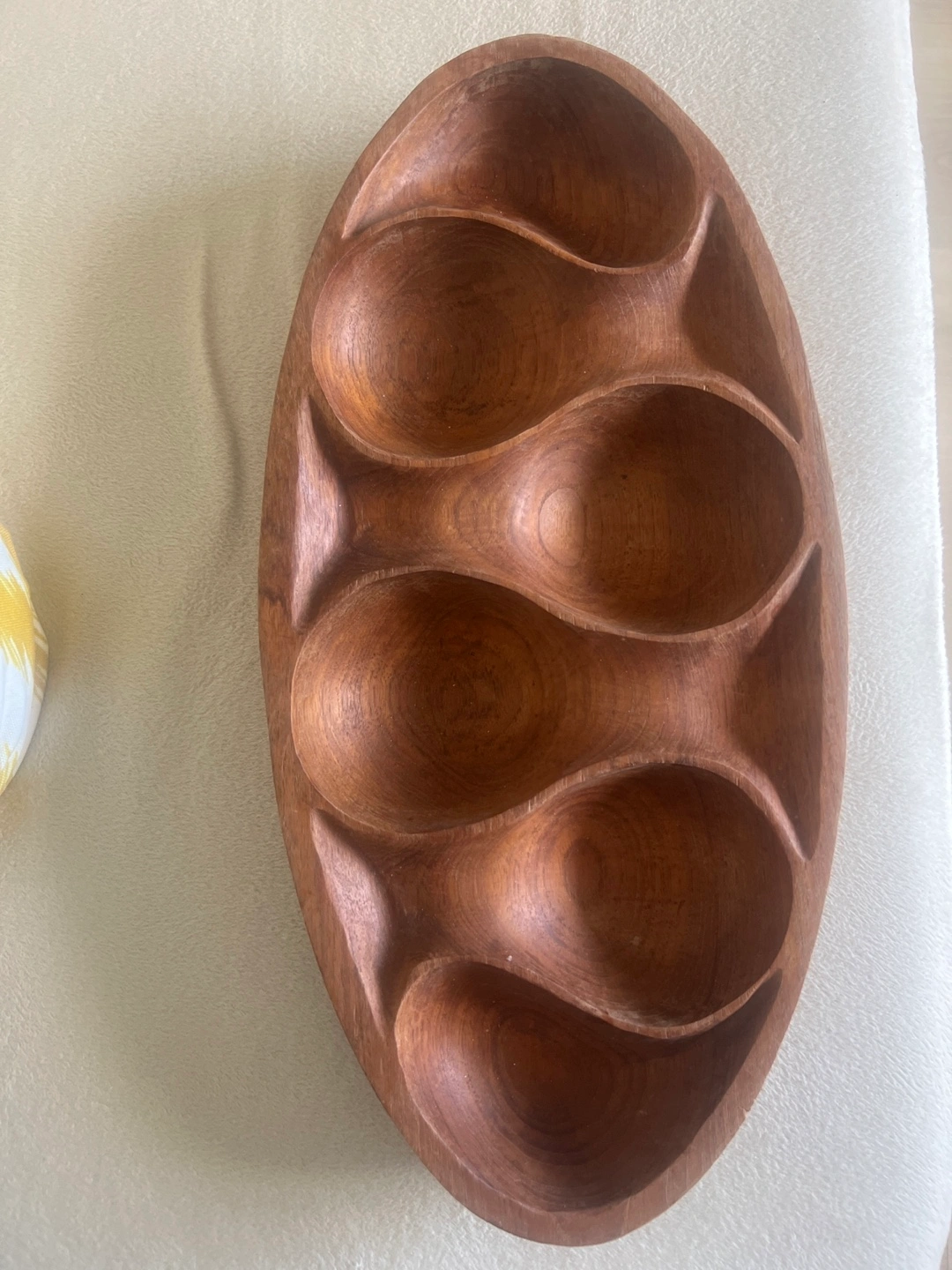 Selling a wooden appetizer serving tray. It has a lovely natural wood grain and is perfect for serving dips, snacks, or appetizers at your next gathering. It's in great condition and ready for a new home!