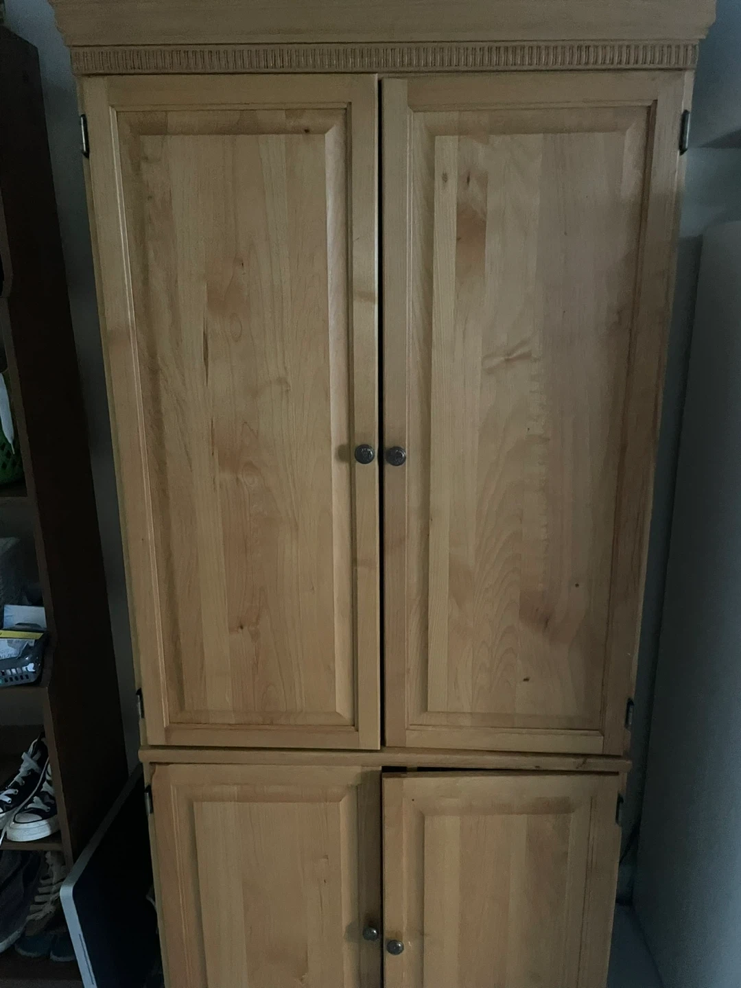 Selling a wooden armoire cabinet. It's a great piece for adding storage and style to any room. The cabinet features a classic design with doors and drawers, offering ample space for clothes, linens, or other household items. It's in good condition and ready to find a new home!