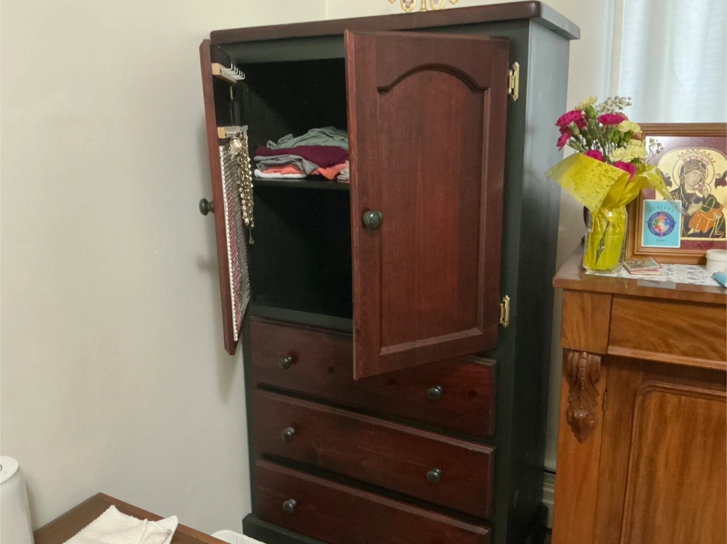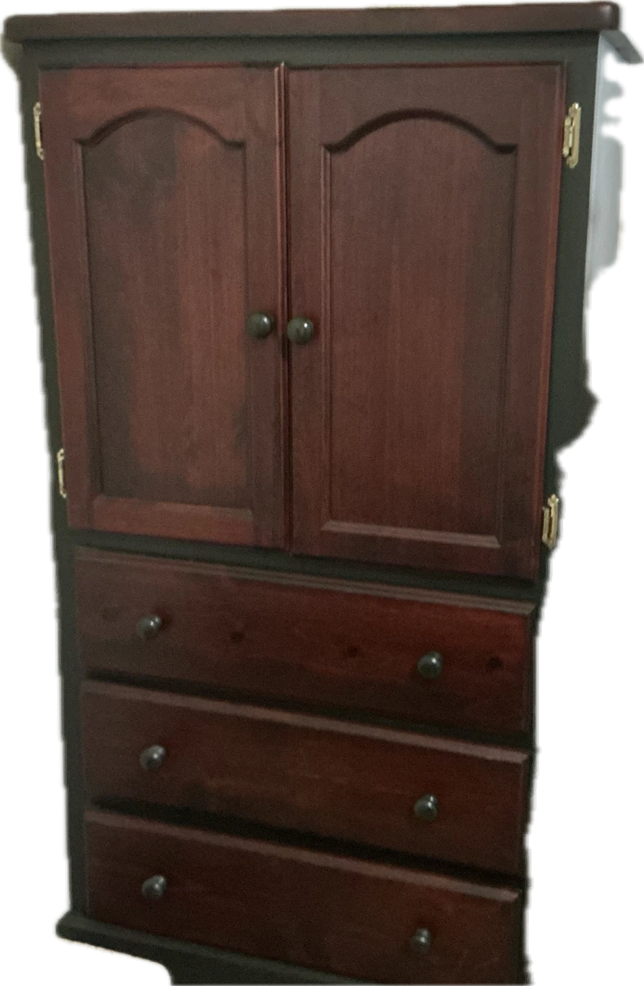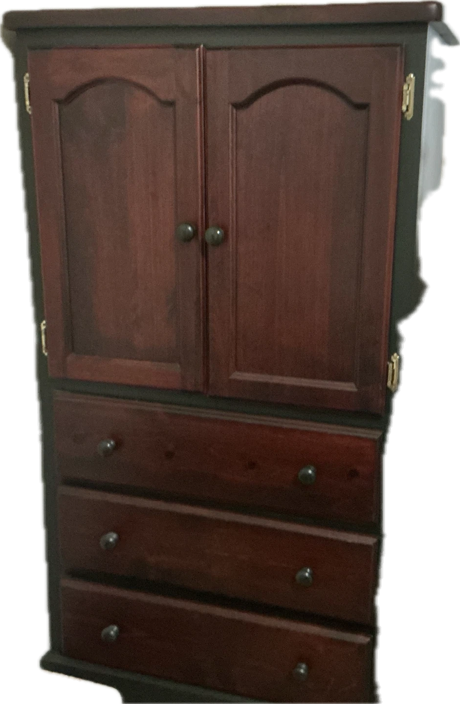 I'm selling a wooden armoire with drawers. It features a cabinet on top and three drawers below, offering ample storage space. The armoire is a beautiful dark wood colour and would be a great addition to any bedroom or living space!