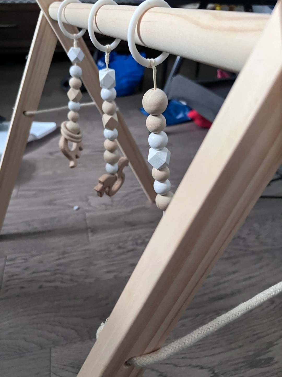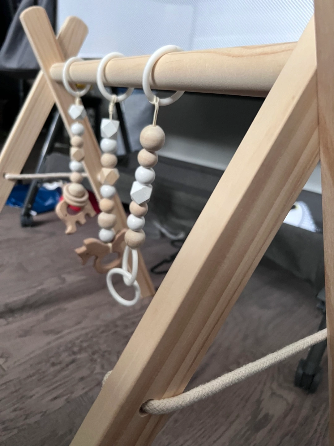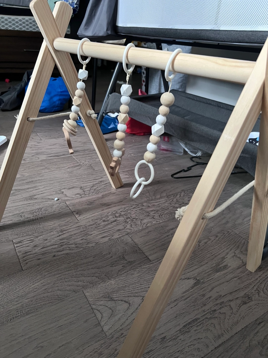 A wooden baby gym. Features hanging toys with various shapes and sizes. Perfect for gentle tummy time exploration. You might find this calming and beneficial for your little one.