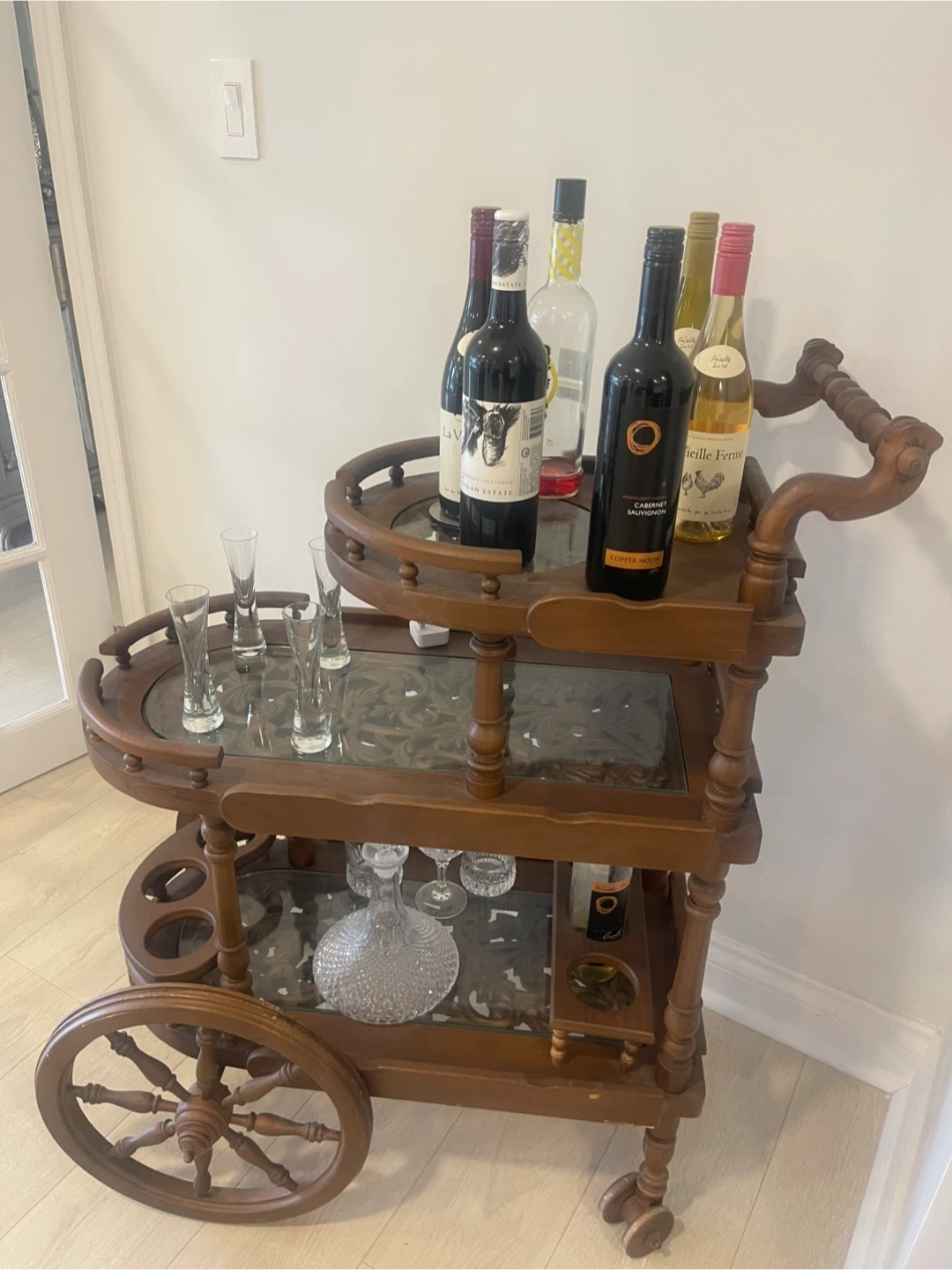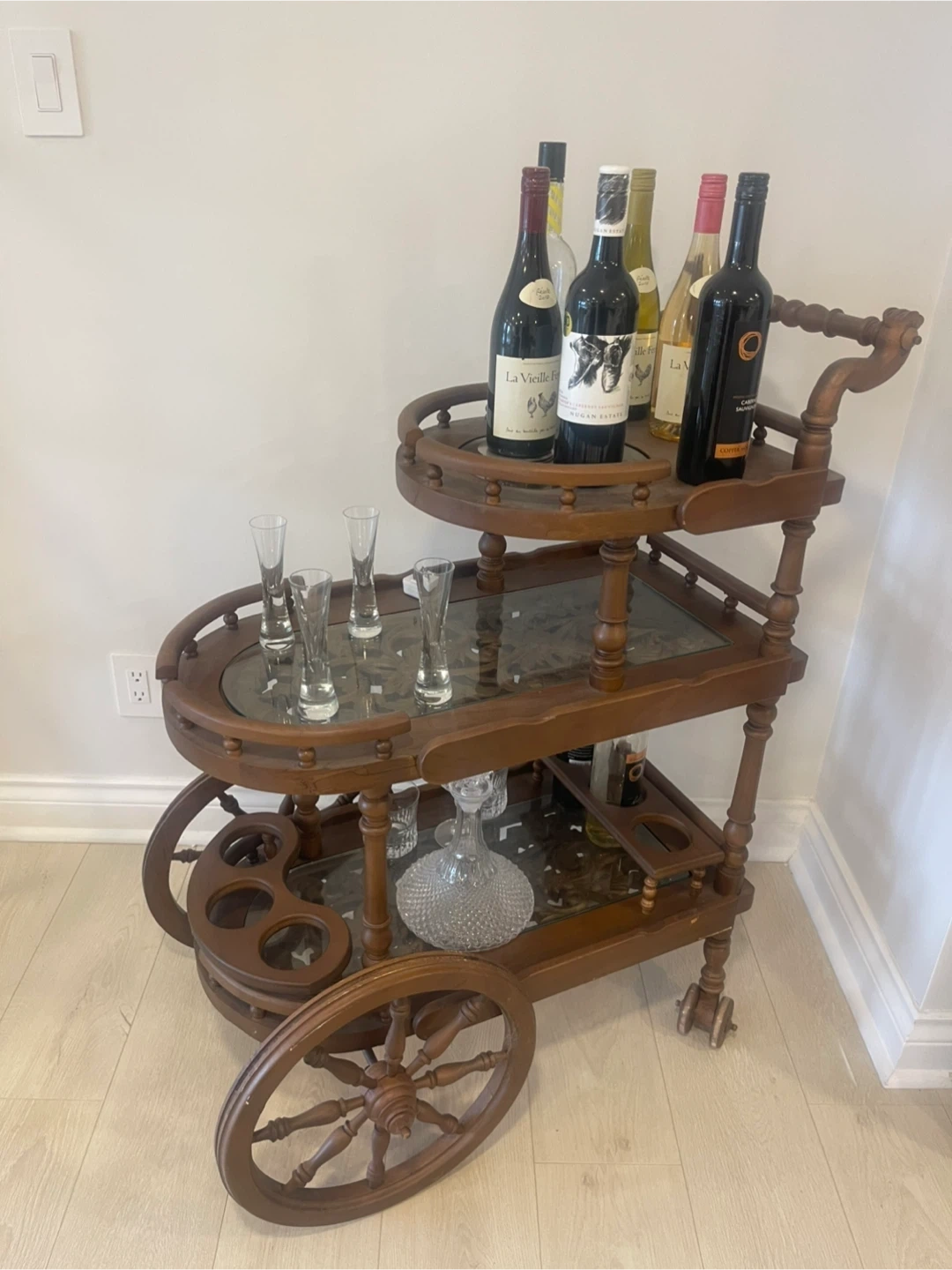 Selling a charming wooden bar cart, perfect for entertaining! It features a multi-tiered design with a handle and wheels for easy movement. Great for displaying and serving drinks and glassware in style